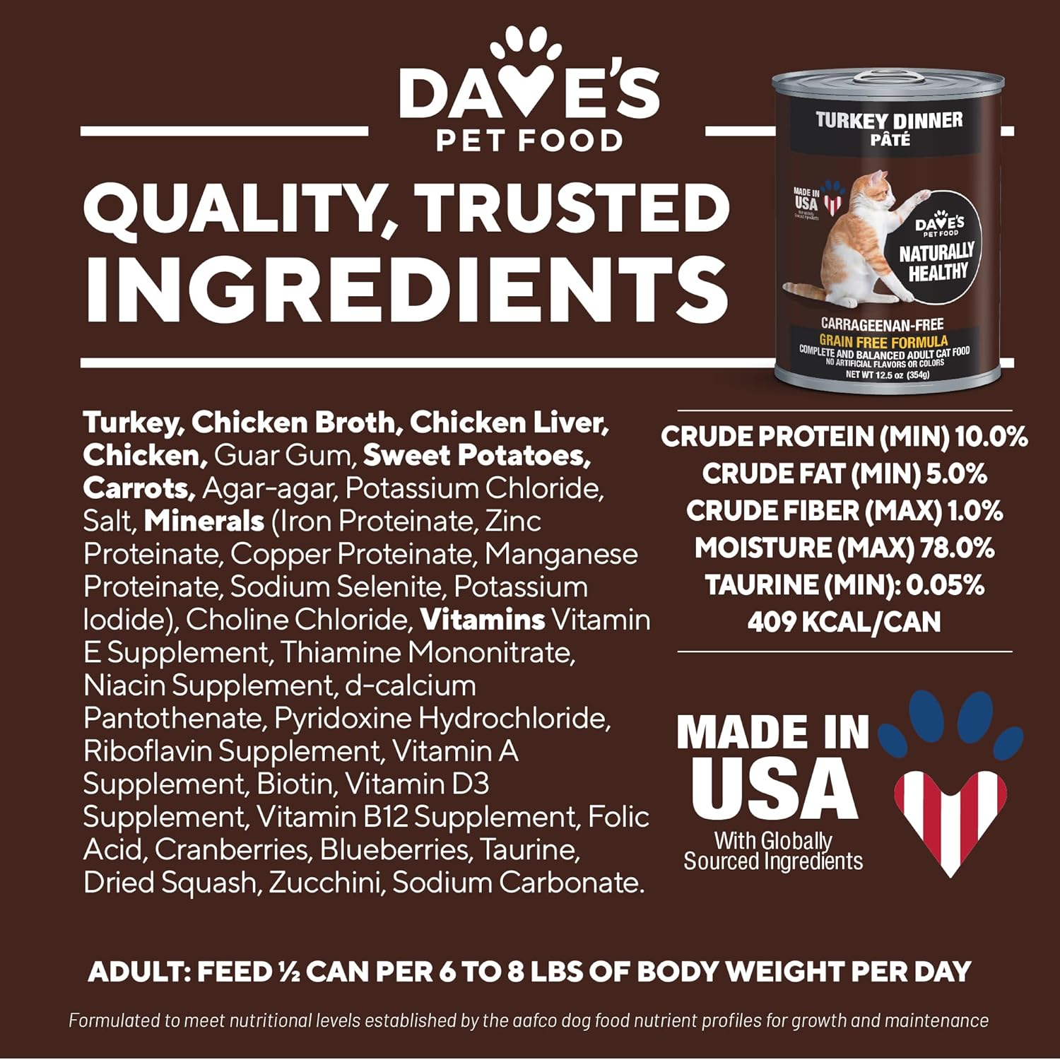 Dave's Pet Food Grain Free Wet Canned Cat Food (Turkey), Made in USA Naturally Healthy, Added Vitamins & Minerals, Gluten-Free, 12.5 oz Cans (12 Pack)