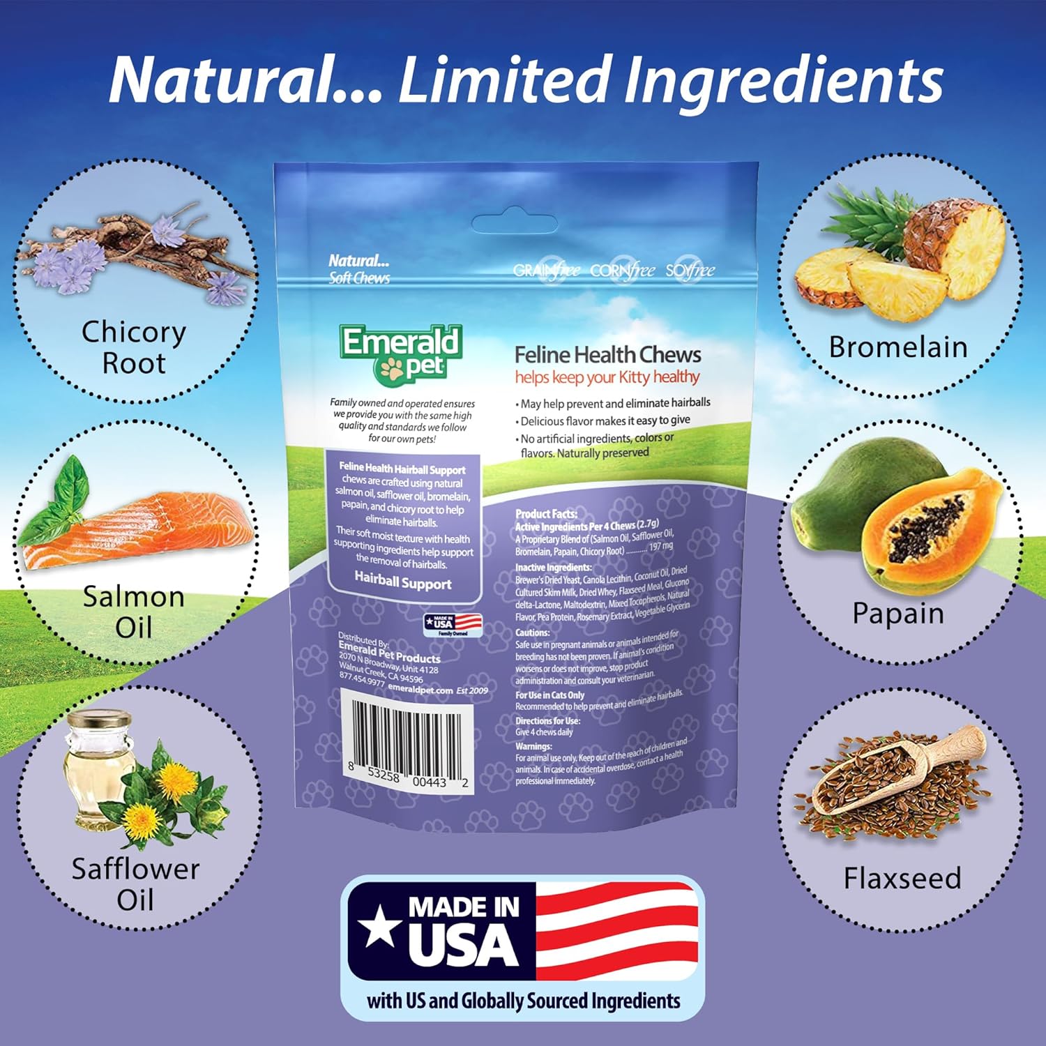 - HEALTHY & DELICIOUS CAT SOFT CHEWS FOR HAIRBALL MANAGEMENT — Emerald Pet Feline Health Chews Hairball Support is a healthy option for rewarding your cat while also providing cat digestive support. Cats love our tasty hairball control cat chews that are made with a proprietary blend of salmon oil, safflower oil, bromelain, papain, and chicory root to help prevent and eliminate hairballs. We recommend giving 4 chews daily for optimal cat digestive health.