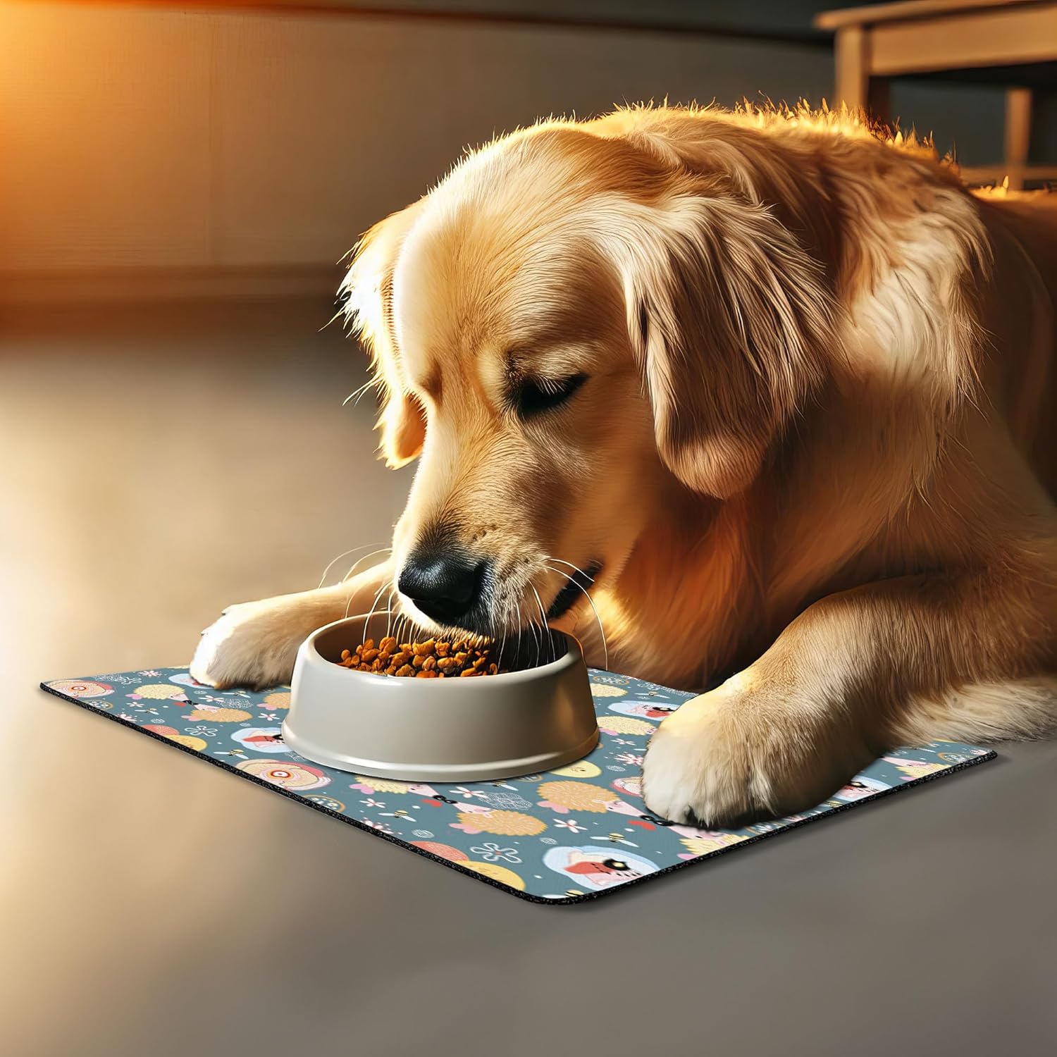 - Features - Fun prints and long-lasting colors. Find any theme and color you want to match your room decor or your pet’s personality. This pet feeding mat can even feature your cat's or dog’s favorite item or design, adding a cheerful touch to your pet’s feeding area.