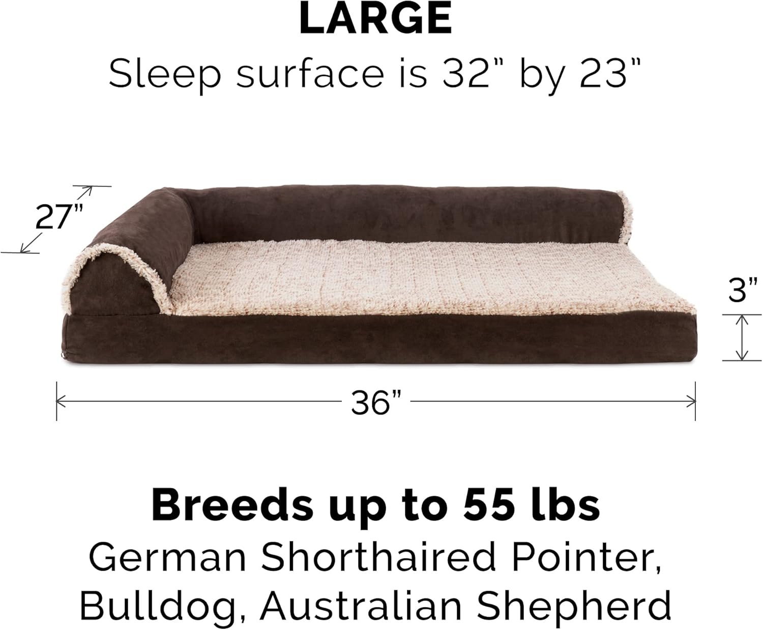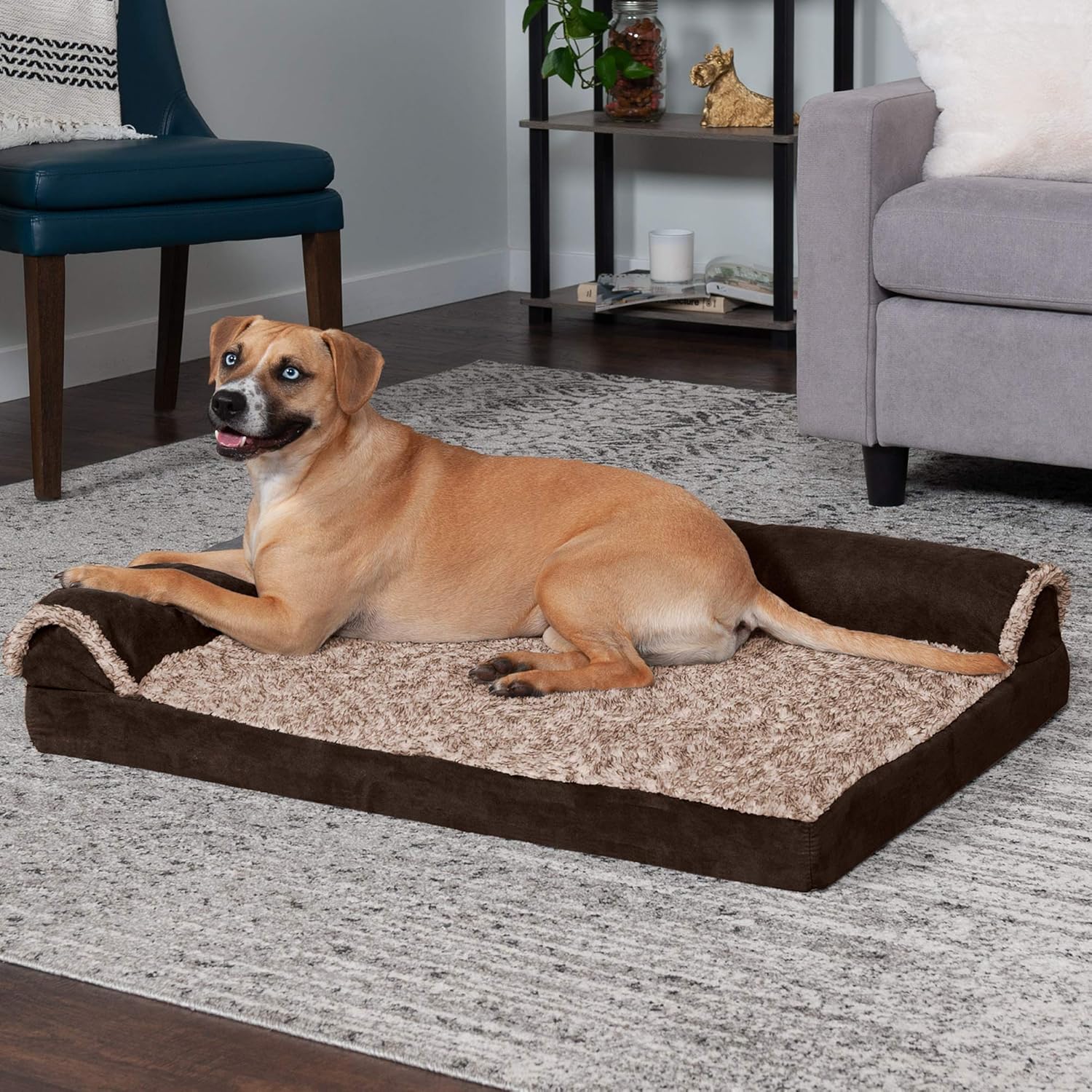 Furhaven Cooling Gel Dog Bed for Large/Medium Dogs w/ Removable Bolsters & Washable Cover, For Dogs Up to 55 lbs - Two-Tone Plush Faux Fur & Suede L Shaped Chaise - Espresso, Large