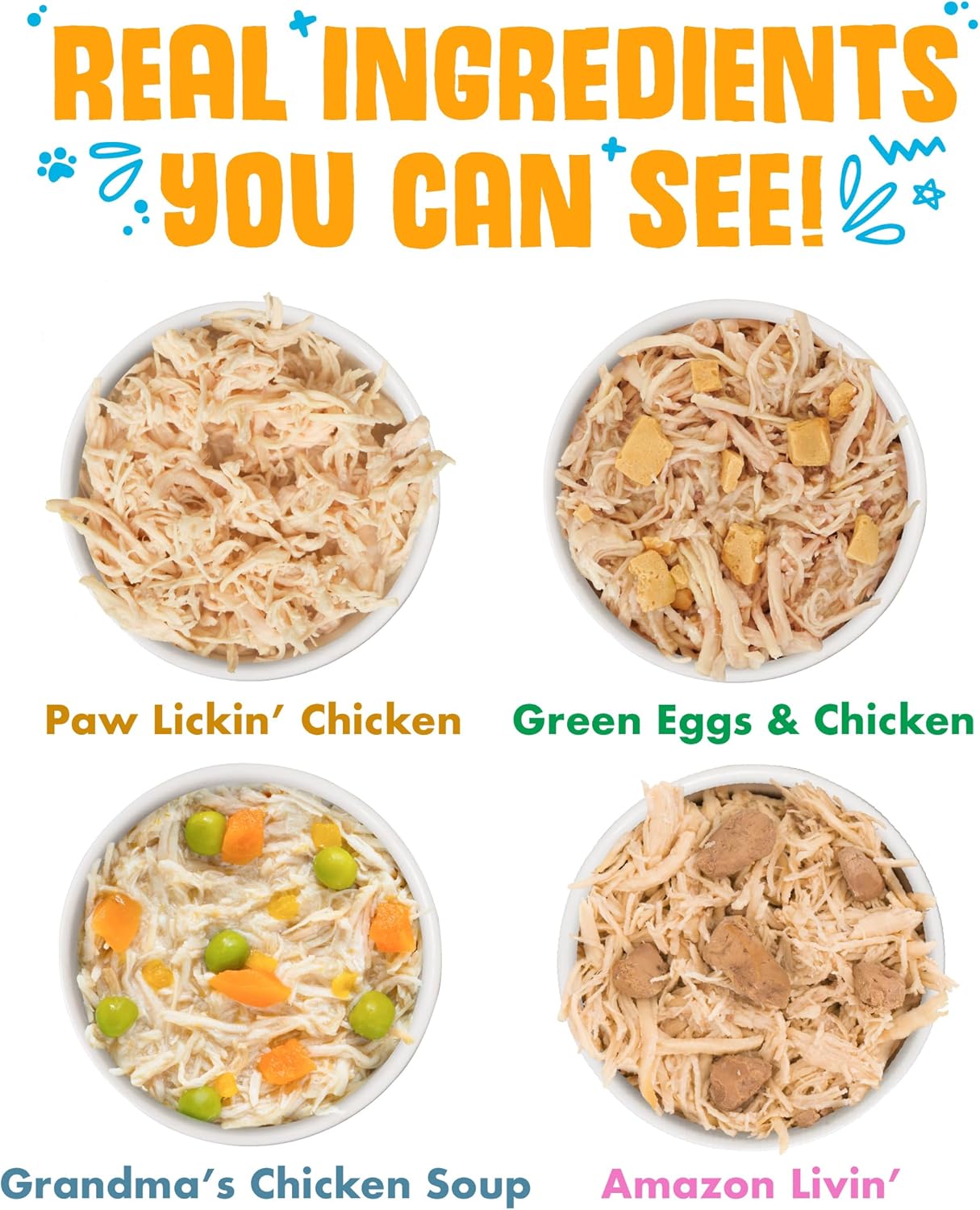 - Variety Pack includes 6 cans of each: Paw Lickin’ Chicken, Green Eggs & Chicken, Grandma’s Chicken Soup and Nine Liver.