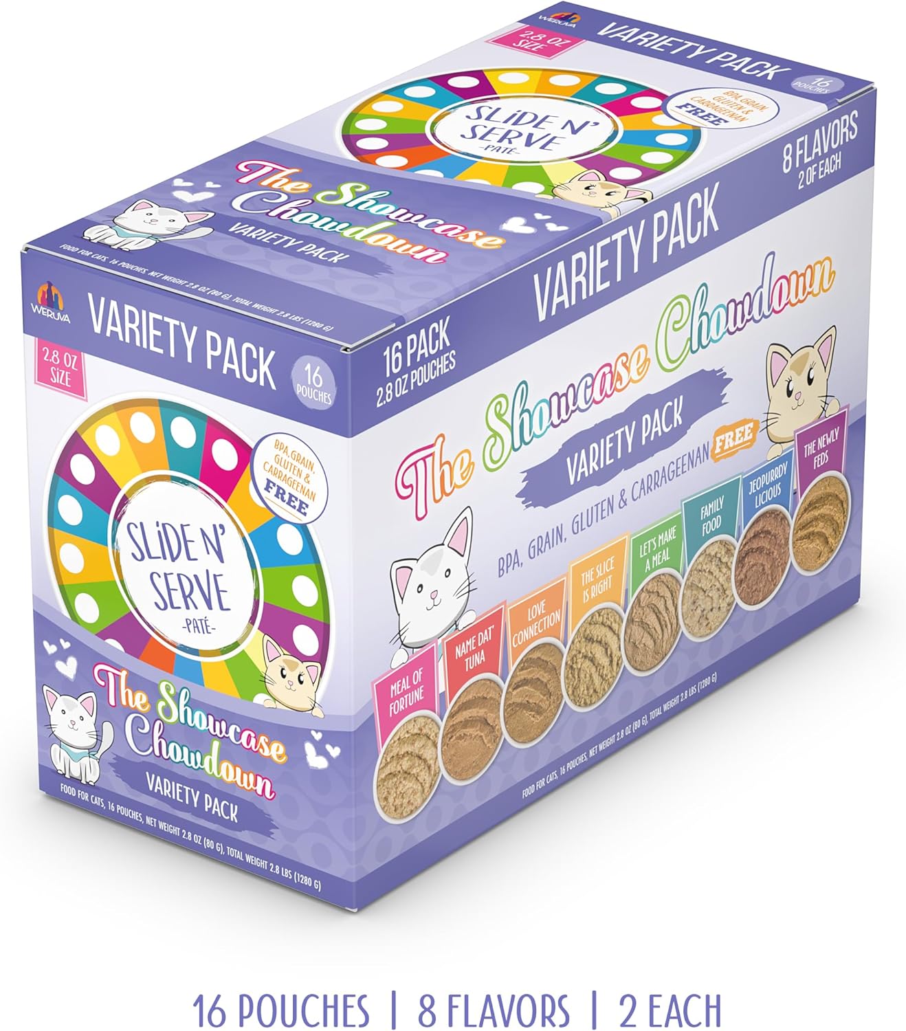 Weruva Slide N' Serve Paté Wet Cat Food, The Showcase Chowdown Variety Pack, 2.8oz Pouch, Pack of 16