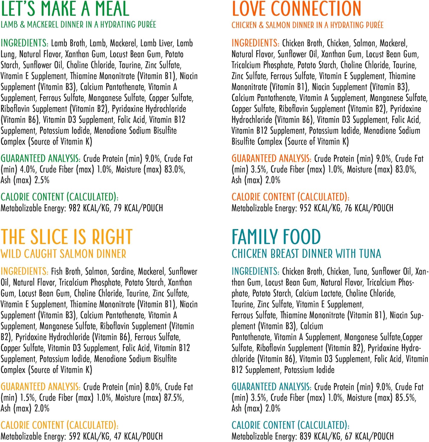 - Variety Pack includes 2 pouches of each: The Newly Feds, Jeopurrdy Licious, Love Connection, Let’s Make a Meal, Meal of Fortune, Name 'Dat Tuna, The Slice is Right, Family Food