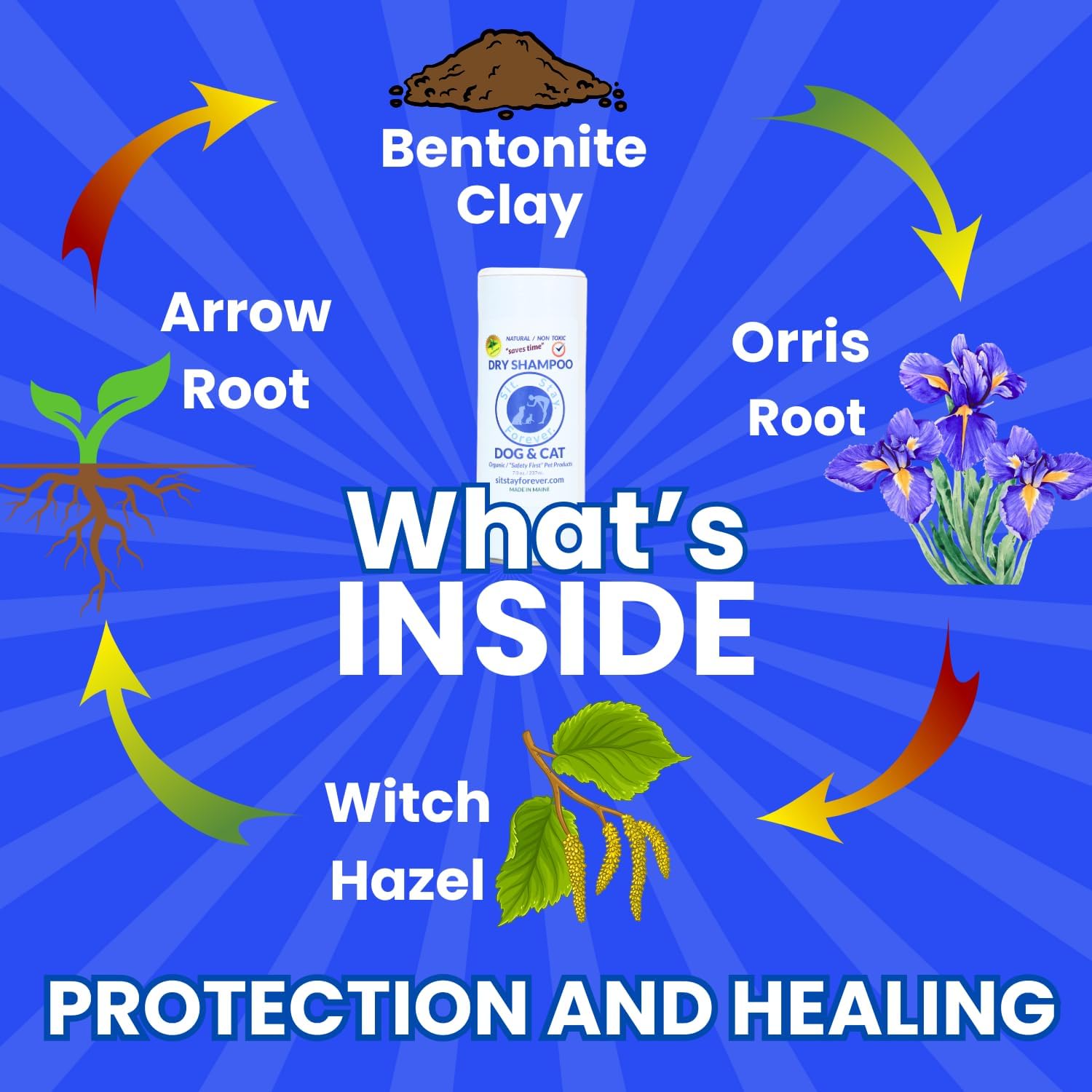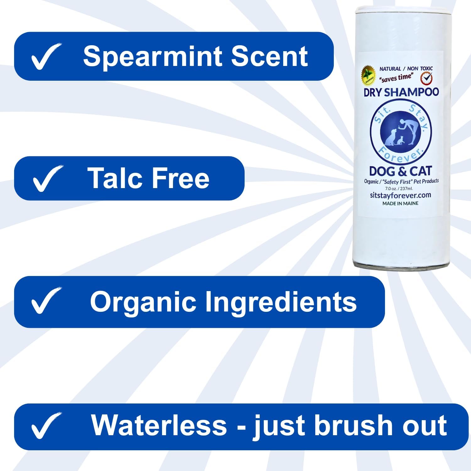 Sit. Stay. Forever. Dry Shampoo for Dogs & Cats – Organic Dry Bath Powder, Talco para Perros, Hypoallergenic, Odor Control for Smelly Dogs, No-Rinse, Anti-Itch, Safe & Natural, Made in The USA, 7 oz
