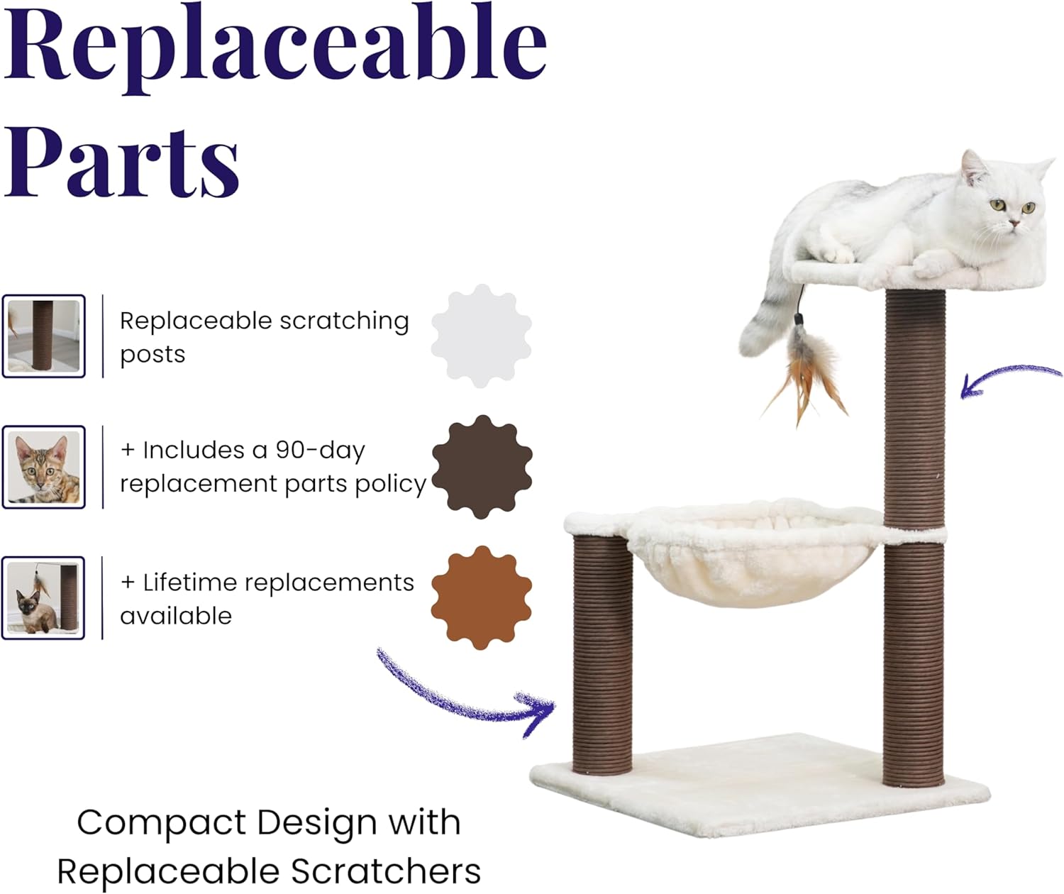 - Replaceable Parts: Keep your cat tree looking like new with easy-to-order replacement parts. Eligible parts are scratching posts, beds, and cushions. Contact us for more information!