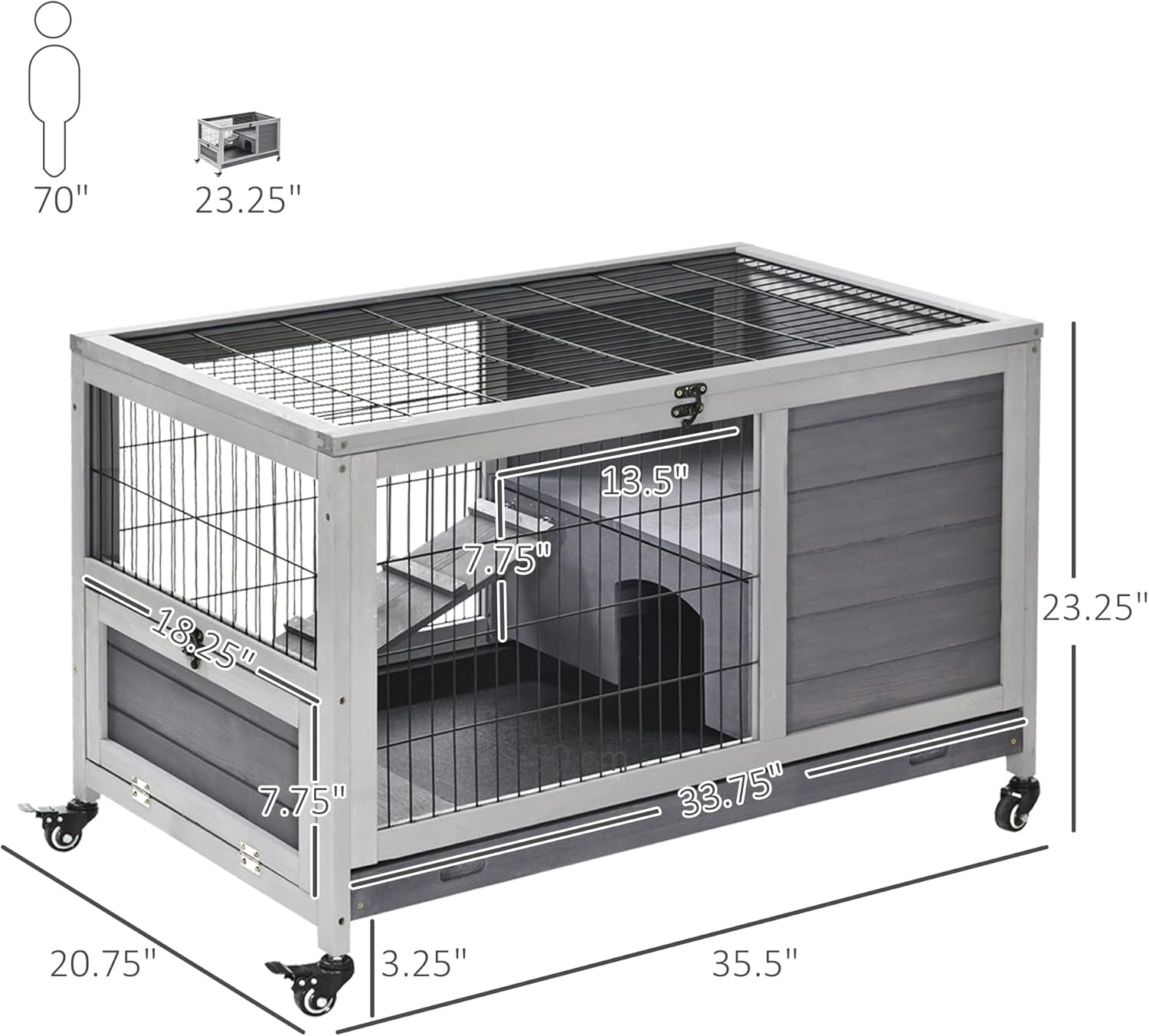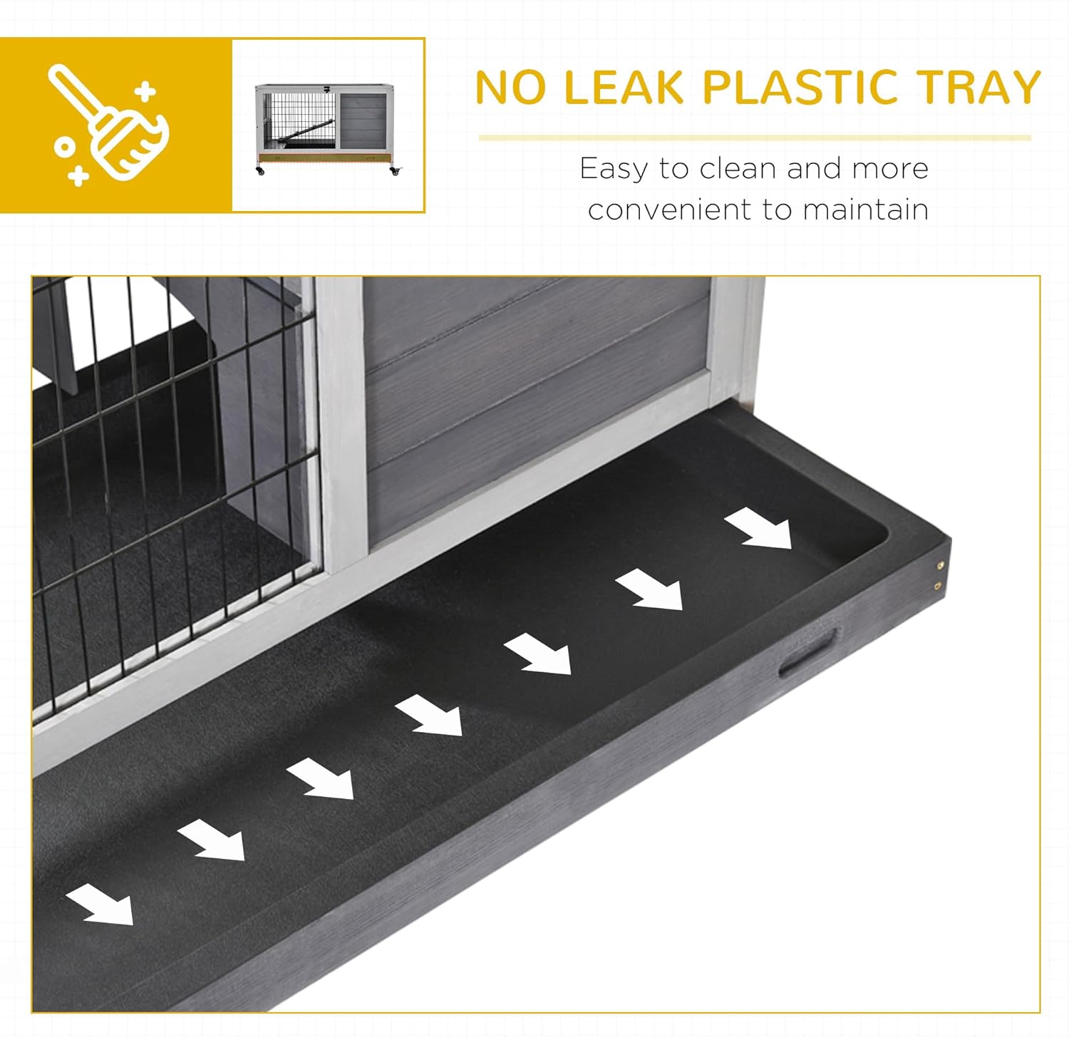 PawHut Wooden Rabbit Hutch Indoor Outdoor, Elevated Bunny Cage with No Leak Tray Enclosed Run with Wheels, Ideal for Guinea Pigs and Small Animals, Gray