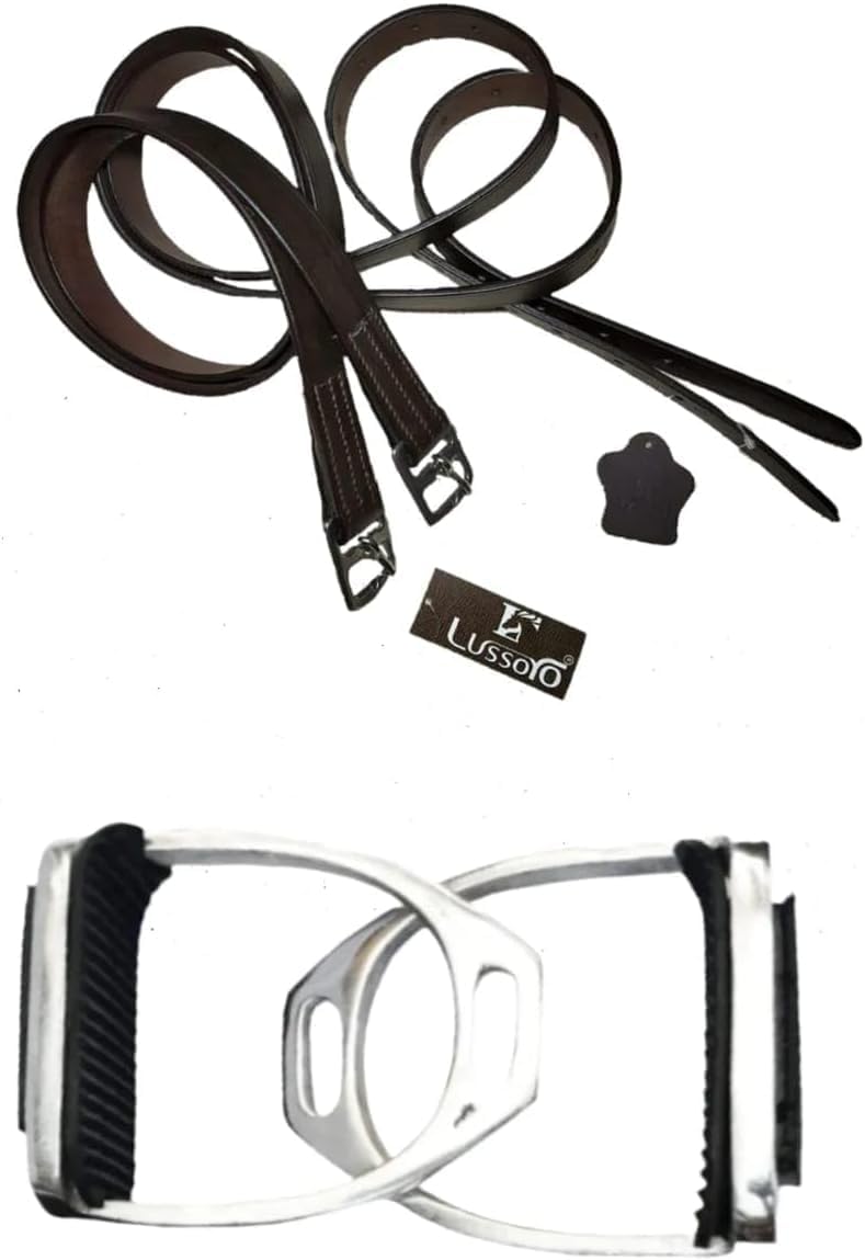 - Lussoro 7 pcs combo Pack Color Brown Product List Saddle, Bridle with Reins, Saddle Pad, leather Stirrups, Foot Stirrups, Girths, Bit