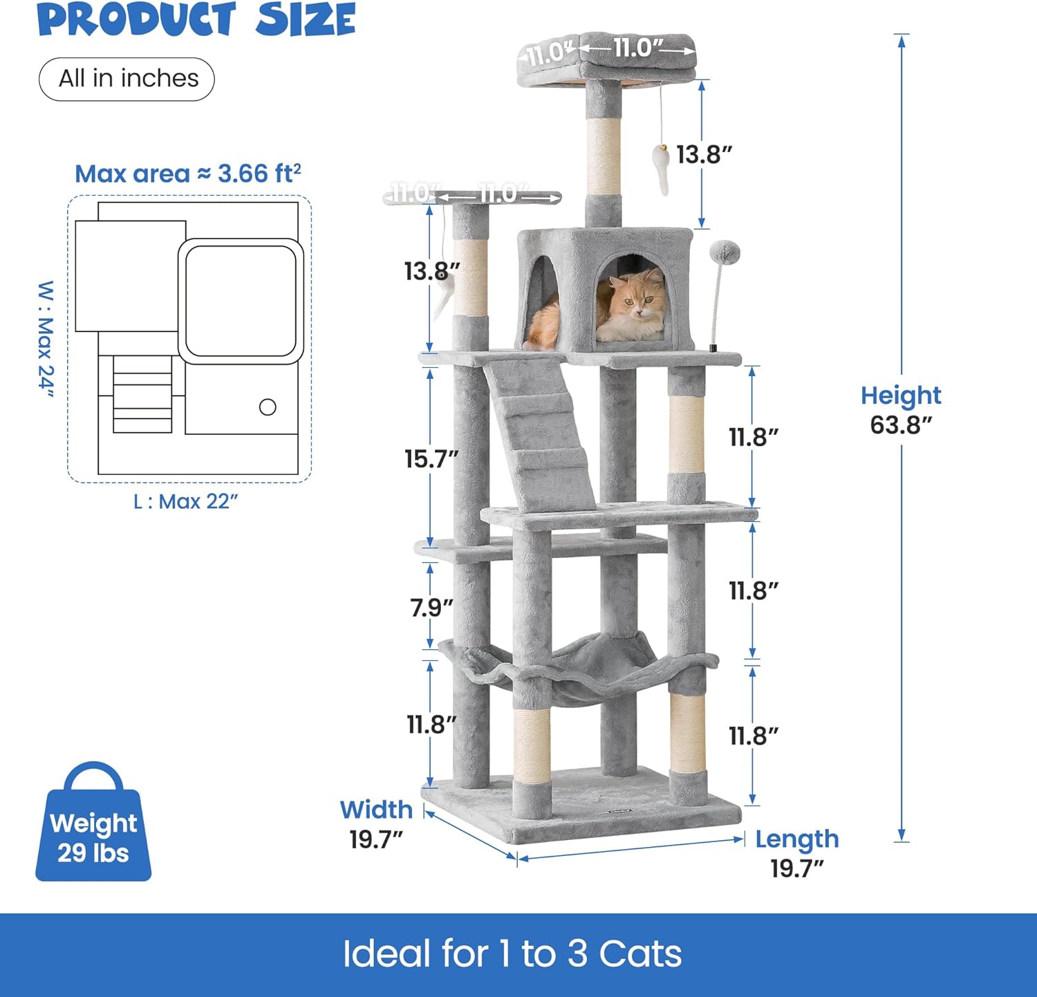 - 【MUST HAVE FOR FAMILIES WITH MULTIPLE CATS】- It can easily house 2-3 medium/large cats, which is an ideal and cost-effective piece for multi-cat families. Overall:63.8'' H x 19.7'' W x 19.7'' L | Base Board Size :19.7'' W x 19.7'' L | Size of Condo:10.2'' H x 11'' W x 11'' L | Weight : 29 lbs