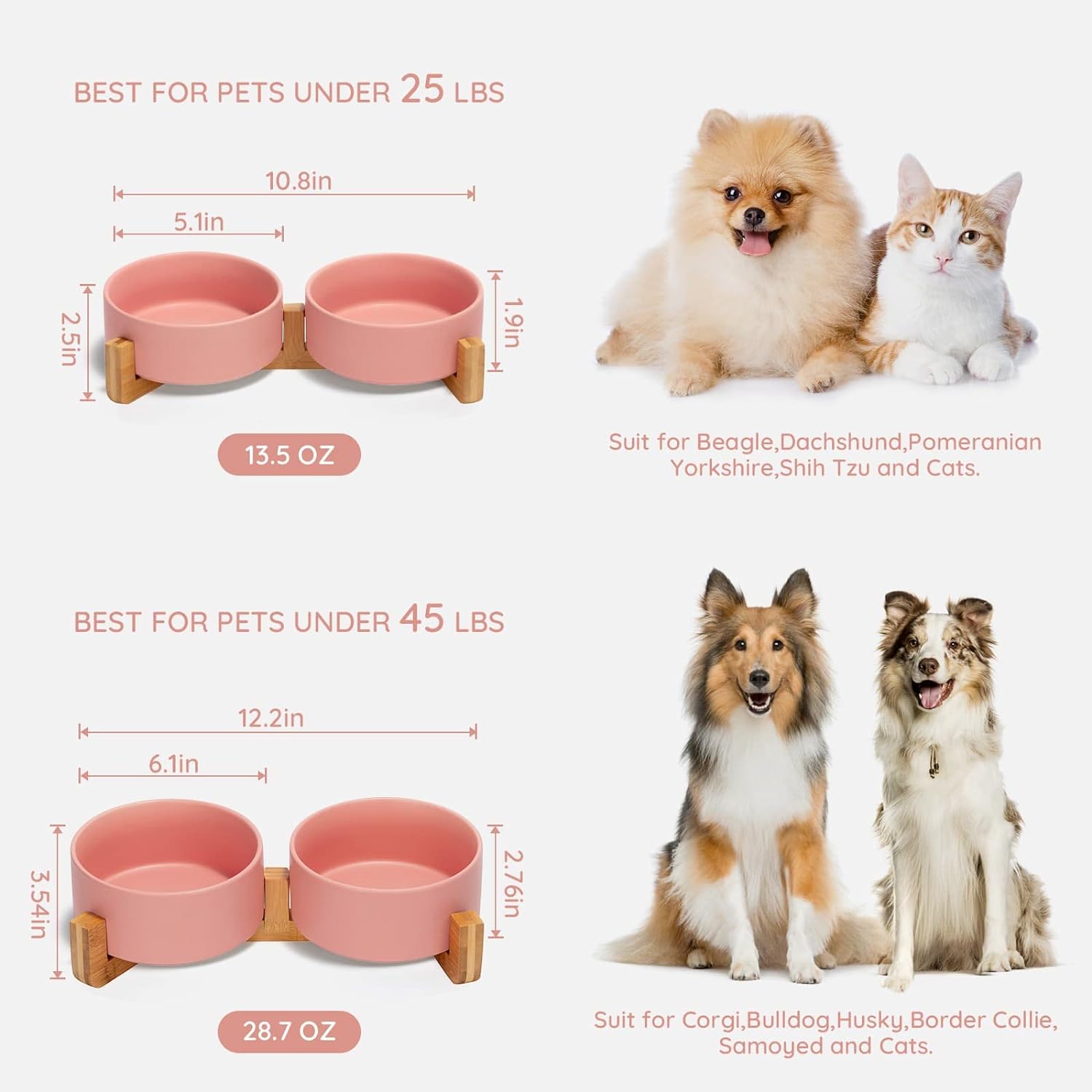 - Double Bowl Design:One dog bowl for food and one for water, Each ceramic cat bowl has a Unique wooden stand, raising the dishes closer to your pet for more comfortable eating