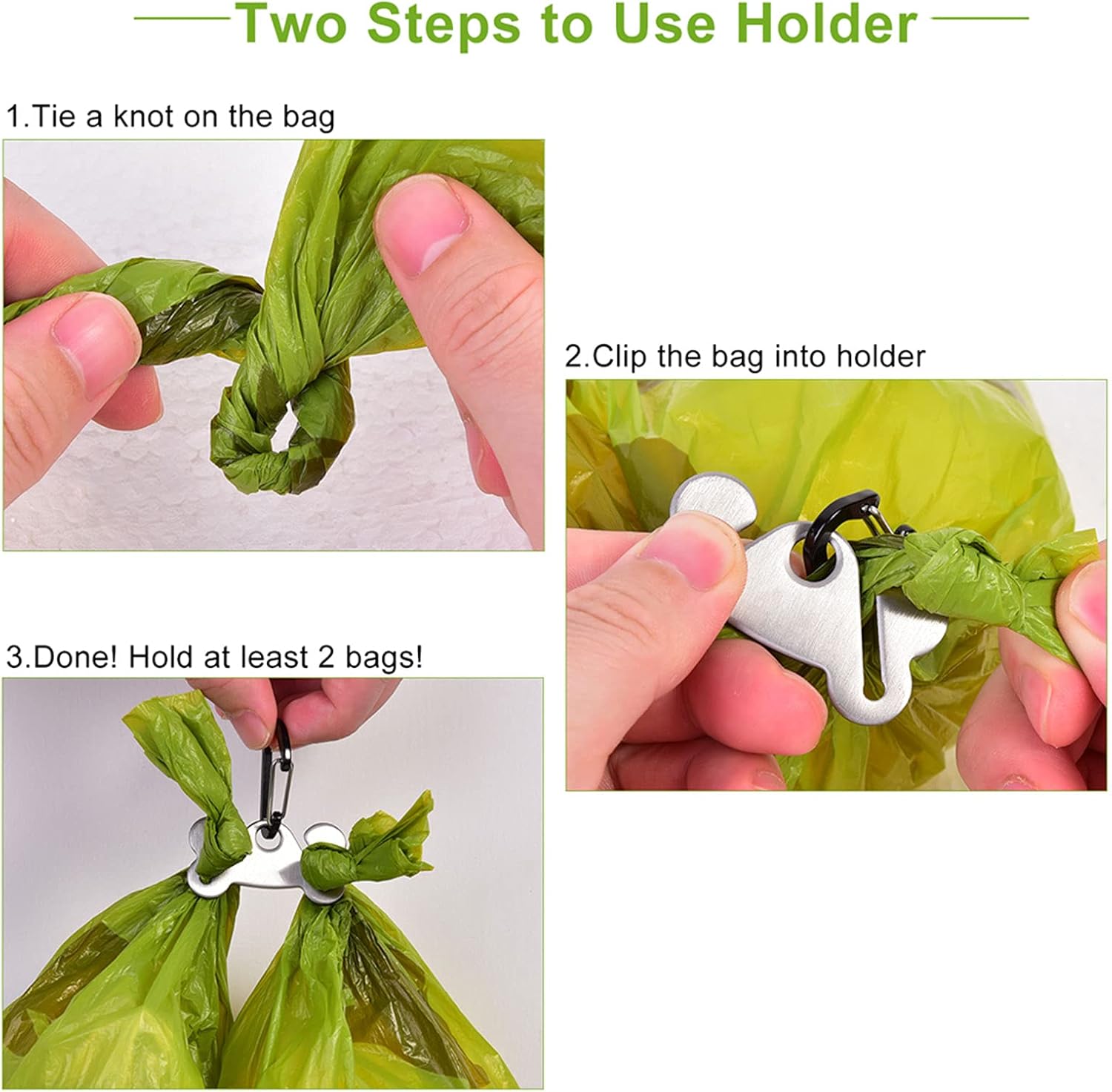 - 【Durable & Easy to use】DURABLE! Made of stainless steel metal, our dog poop bag carrier / holder is super durable. You can use it for a long time. Also it’s very easy to use! Just tie a knot in the dog poop bags. Then hold the knot on the metal holder. And begin your hand free walking time!