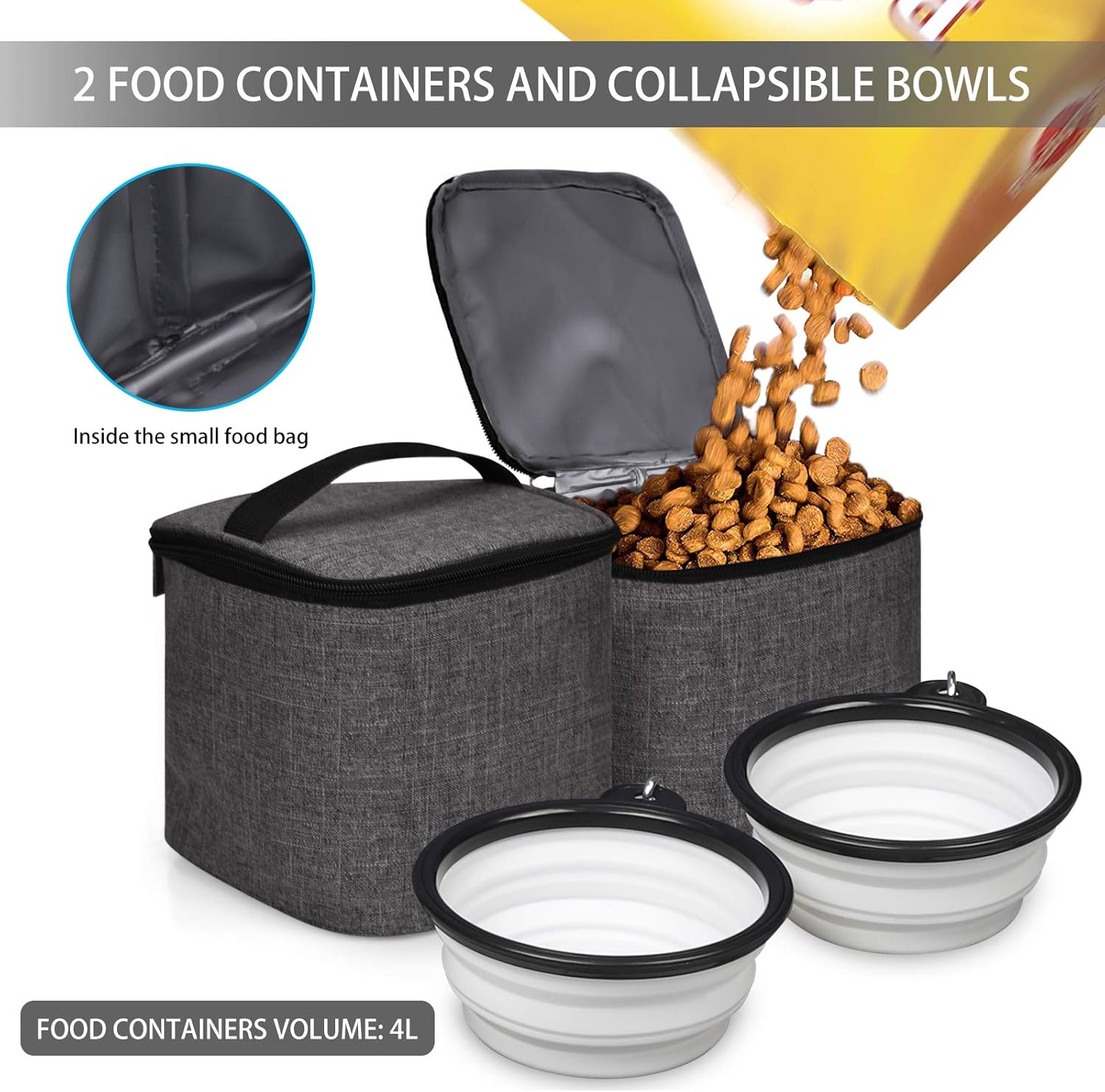 BAGLHER Pet Travel Bag, Double-Layer Pet Supplies Backpack (for All Pet Travel Supplies), Pet Travel Backpack with 2 Silicone Collapsible Bowls and 2 Food Baskets Grey