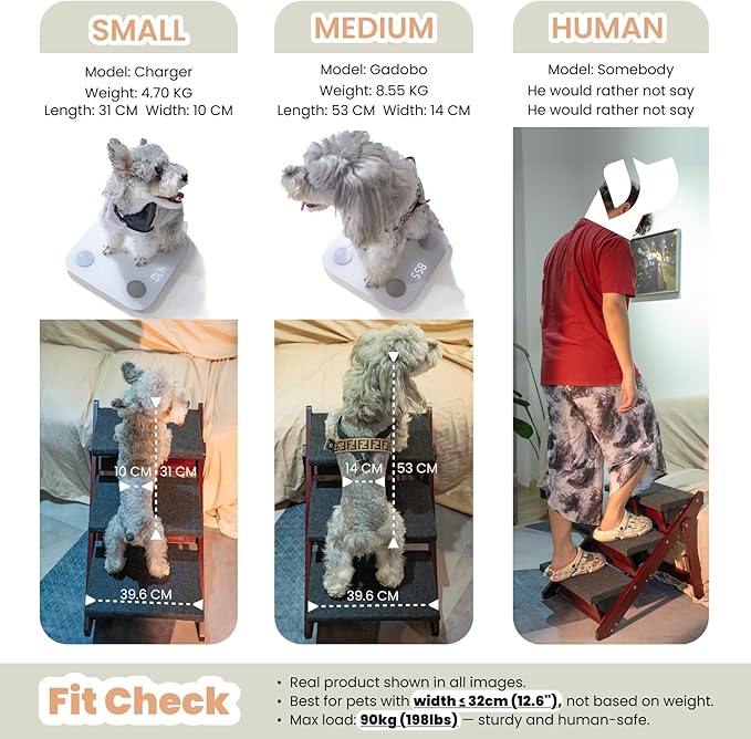 - 5. Size & Weight Capacity Step:15.6" L x 9.3" W x 5.9" H in 3-step full open: 24.8" L x 17.2" W x 19.5" H in. Folded: 31" L x 17.2" W x 3.15" H in Max load: 100kg / 220lbs. Designed for small and medium dogs and cats with waist width ≤32cm / 12.6in.