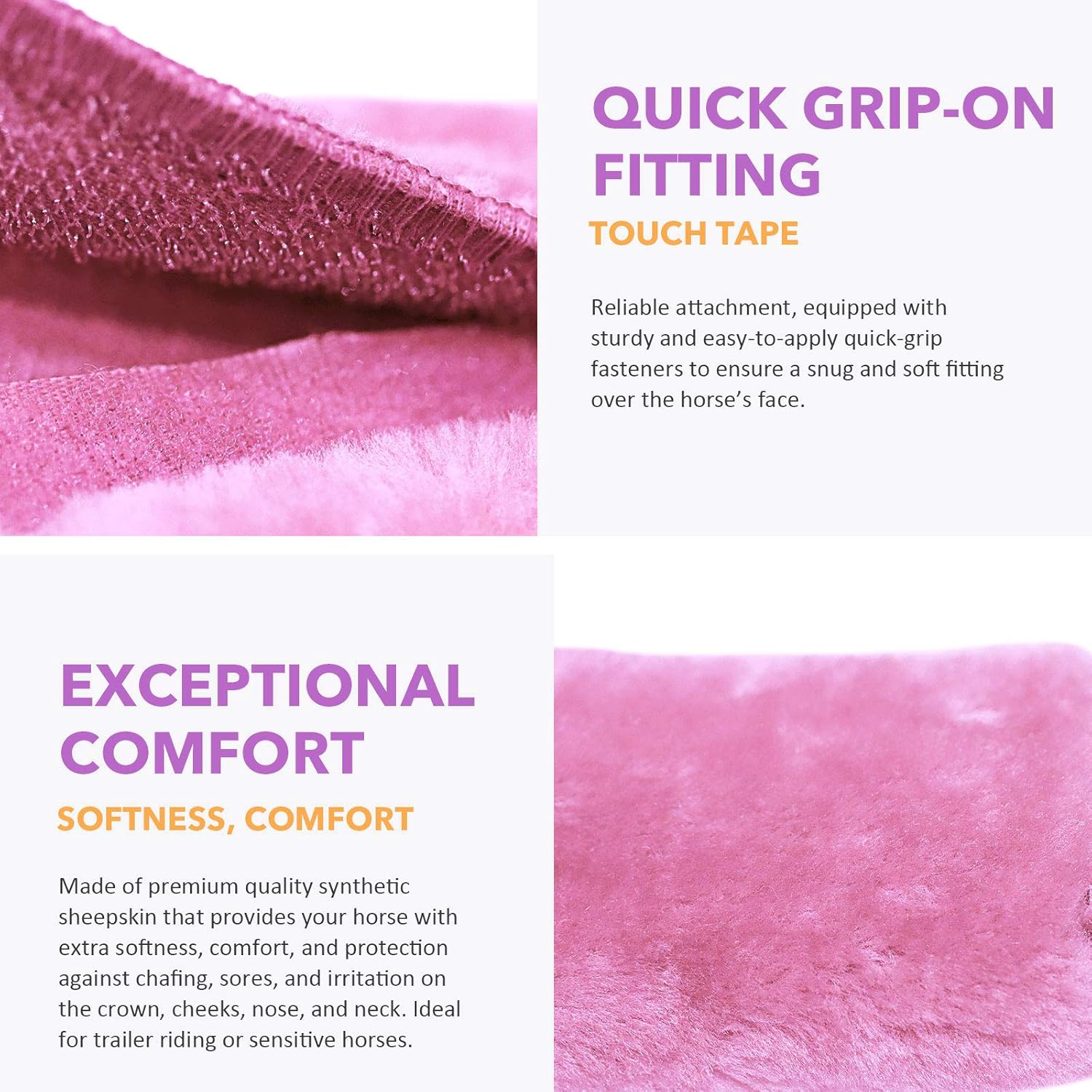 - QUICK GRIP-ON FITTING: Reliable attachment, equipped with sturdy and easy-to-apply quick-grip fasteners to ensure a snug and soft fitting over the horse’s face.