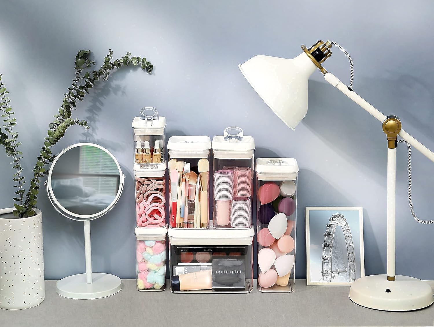 - STACKABLE & SPACE SAVING: Containers are designed to be stacked firmly on top of each other to save space in your pantry, fridge, desk, room, kitchen countertop, cupboard, and cabinet shelves. Our Regular sized containers can be stacked firmly with Rectangular sized containers to help you max out space efficiency.