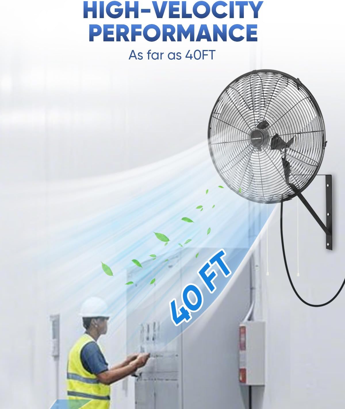 - Powerful Airflow for Large Spaces. The KEN BROWN 20 Inch Industrial Oscillating Wall Mount Fan delivers a maximum airflow of up to 5500 CFM, making it ideal for cooling large areas such as garages, workshops, and outdoor patios. Its robust performance ensures efficient air circulation in industrial environments.