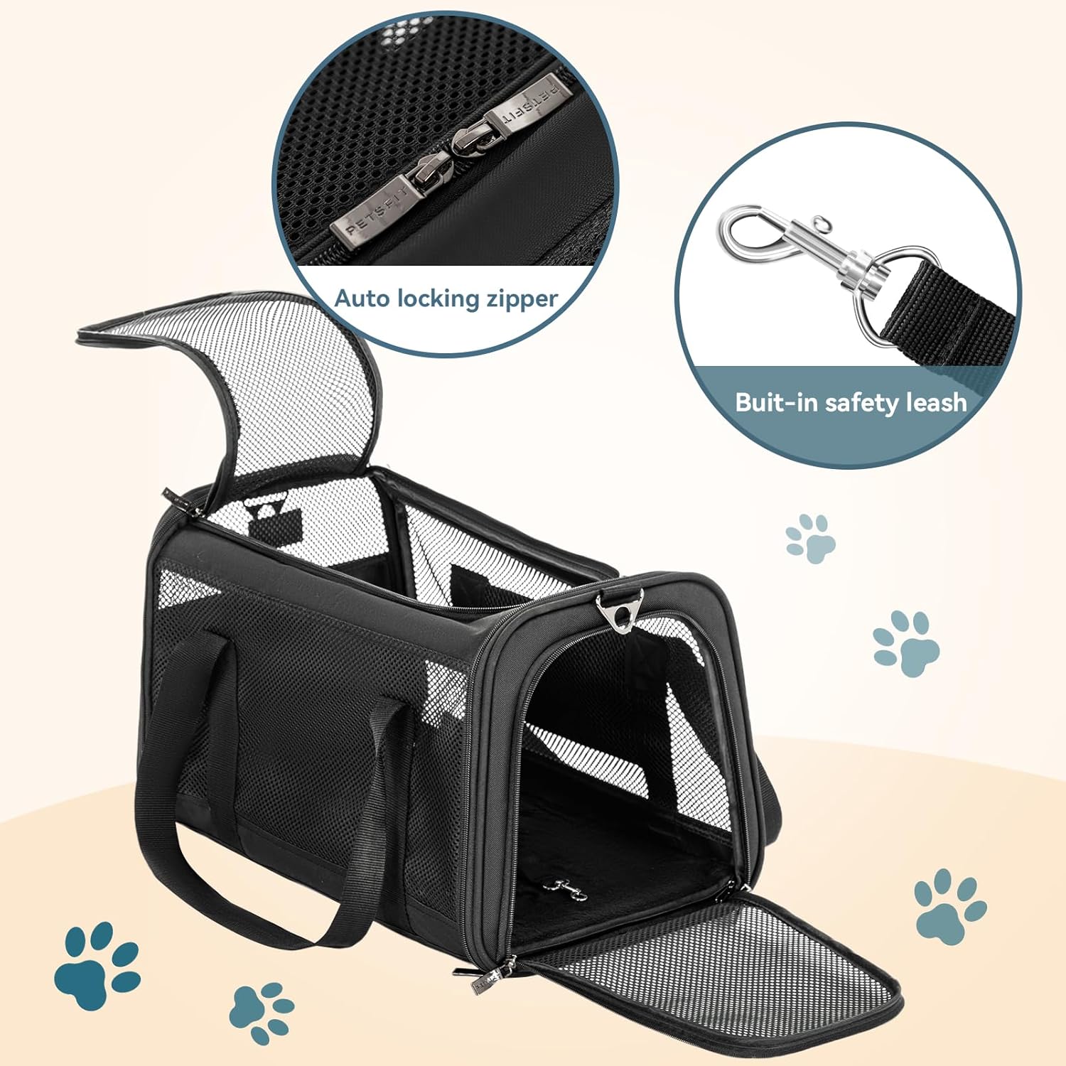 - 【Safe Design】Built-in safety tether inside keeps your pets from jumping out; Self-locking metal zipper head prevents pets from escaping; Back strap can fasten the carrier to your luggage or car seat for secure transporting. All for your pet's travel safely.