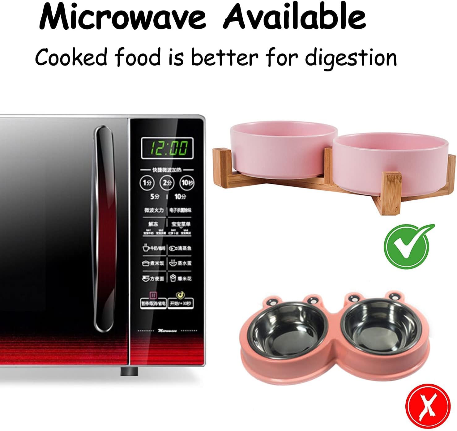 - EASY TO CLEAN CERAMIC - This easy clean dog bowl set is dishwasher proof, as well as easy to handwash and wipe down. With thick walls, these ceramic bowls for pets are sturdy, weighty yet not too heavy. Double Bowl Design:One dog bowl for food and one for water, Each ceramic cat bowl has a Unique wooden stand, raising the dishes closer to your pet for more comfortable eating