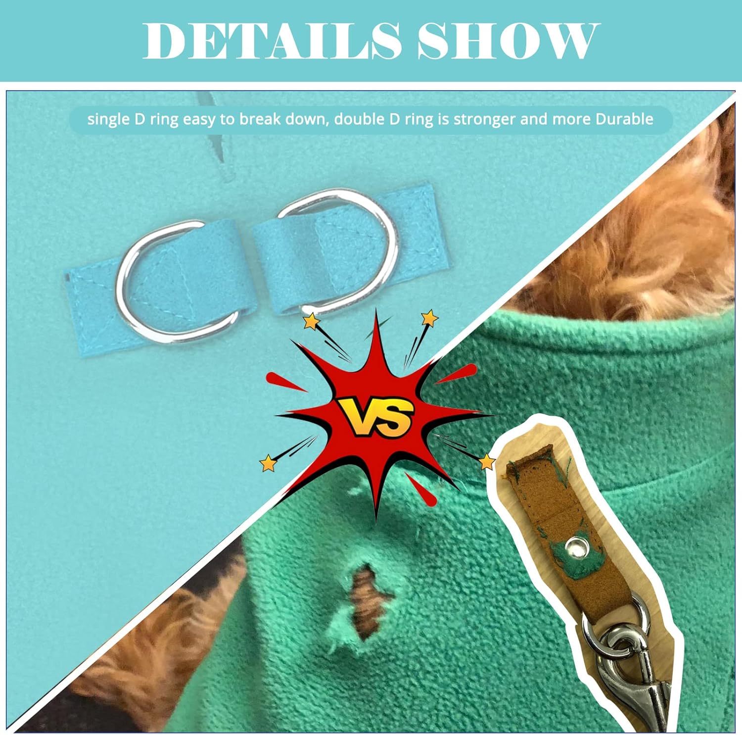 - [Double D-rings For Leash Attachment] It features two D-rings on the back to use for walks. It is easy to attach the leash,There are two pieces of leather stitched well into the clothes ,so stronger than one o-ring fleece coat . One O-ring breaks down easily, you could lose your dog if the leash attachment is not strong.