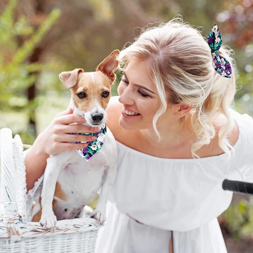 - Matching Bandana and Scrunchies- It’s full of love when your pets is wearing the purple dog bandanas and you are wearing the bow hair ties. When traveling, sleeping, taking photos or daily walking, adorable puppy bandana flowers and floral scrunchie is a pretty accessories. The scrunchie can be worn as a wrist accessory, and as a headband to hold your hair. Beautiful dog drool bib and scrunchie with purple, white florals and green leaves pattern, it’s nice photo props.