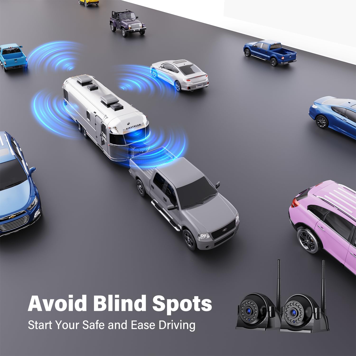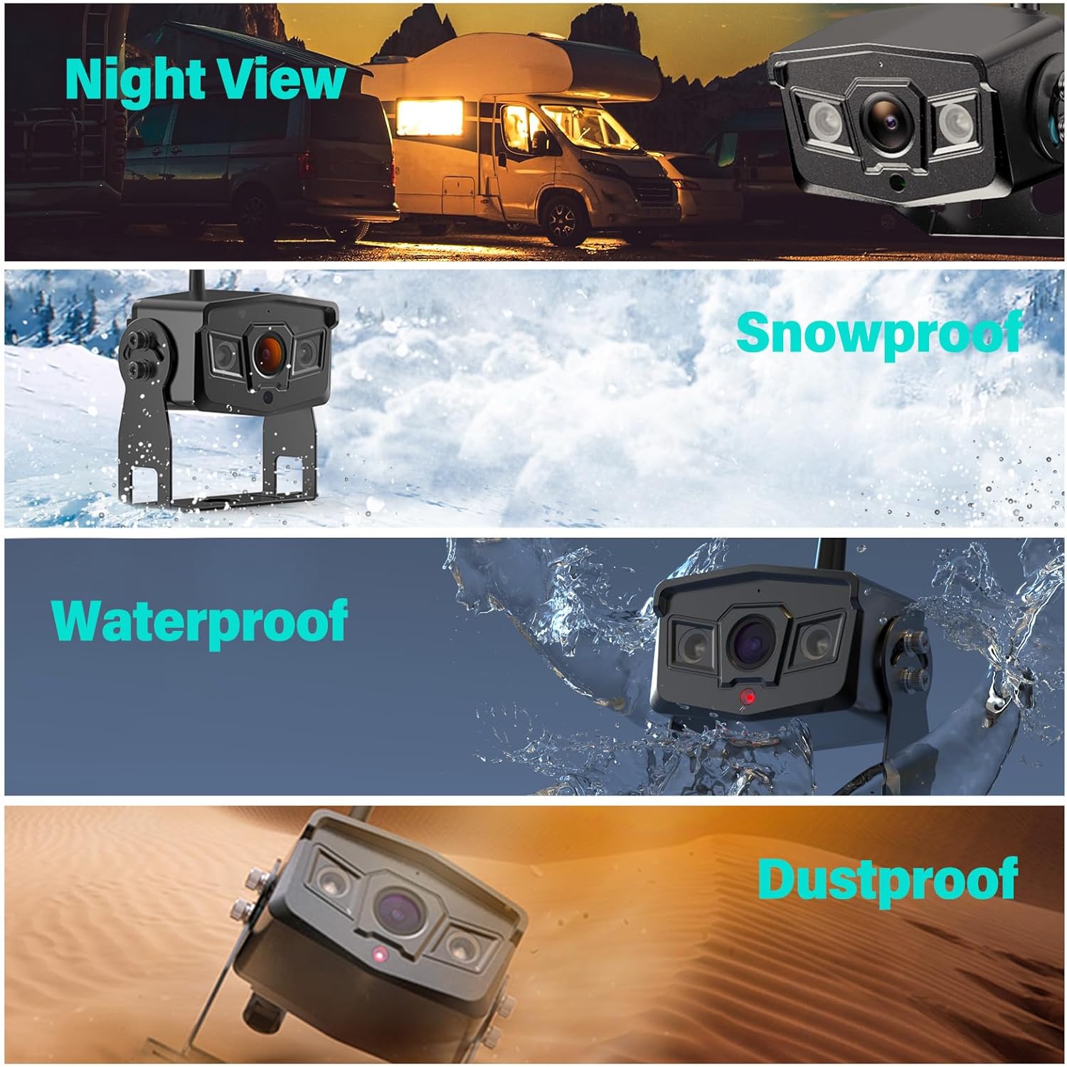 - šš Long Signal Transmission Distance - This trailer backup camera wireless with monitor is suitable for Cars, RV, Truck, Semi-Trailer, Pickups, Camper, Van, 5th wheel, Motorhome. The signal can reach over 300ft in open area, and 50ft on vehicle for reversing or 36ft on vehicle for continuously use. With IP69K waterproof standard, the wireless backup camera rv can work in extreme weather from -4ā~176ā. No lens water or fog issues.