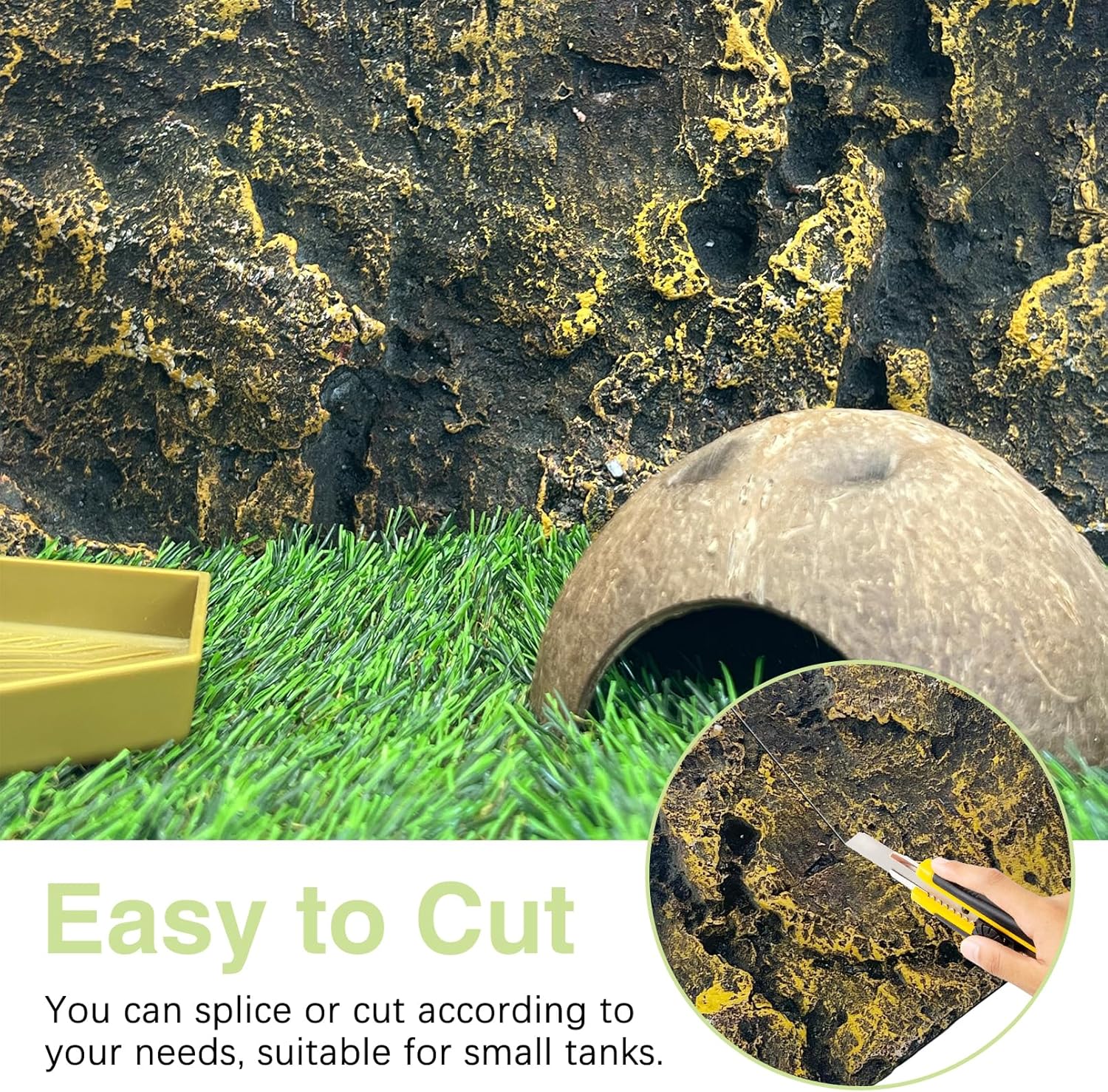 - 【Easy to Cut and Install】Corn snake tank background is an easy to cut background that can be easily cut. With a utility knife you can cut it into the right size for the tank and easy to put together. If used in a fish tank, it is recommended to fix it with glue to avoid the backdrop from floating up