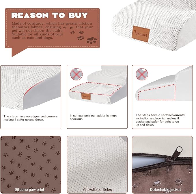 - Safer,Wider&Deeper Steps:Our dog stairs are excellent for those older dogs who are less mobile as they age or for cats with injuries. More wide and deep steps are helpful for reducing the strain that constantly jumping up and down onto lower bed,sofa can have on your pet's joints,and topmart dog steps will not shake and slip during use. The cover made of corduroy is more frictional than other covers, pets will not slip on the stairs.