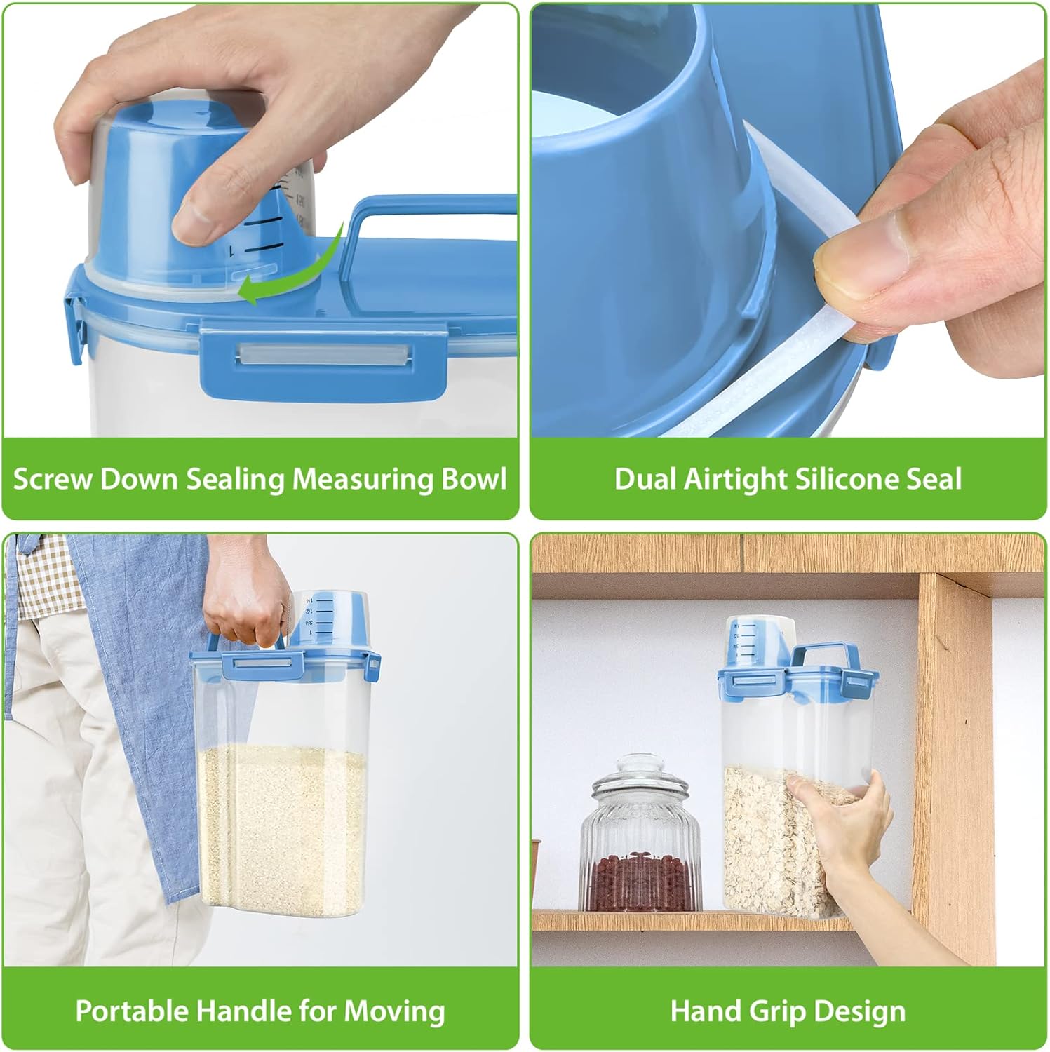 - RICE DISPENSER with POURING SPOUT: it adopts an ergonomic handle, comes with a measuring cup. The barrel body has a standard scale so you can pour things quickly and accurately every time. Slim and compact and space-saving