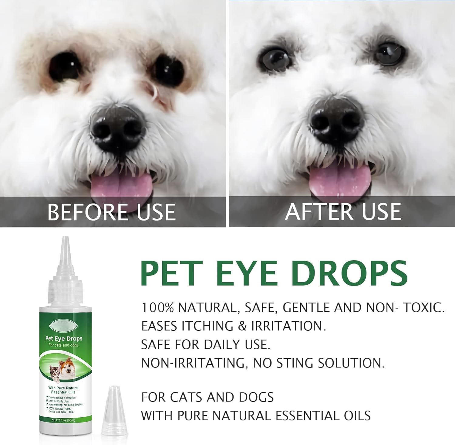 - 🐱🐶100% Natural Ingredient Treatment:The Pet Eye Drops with Pure Natural Essential Oils can Cleanse and Promote Healthy Eyes,Eases Itching & Irritation.Enabling Your Dog or Cat to be Discomfort Free!