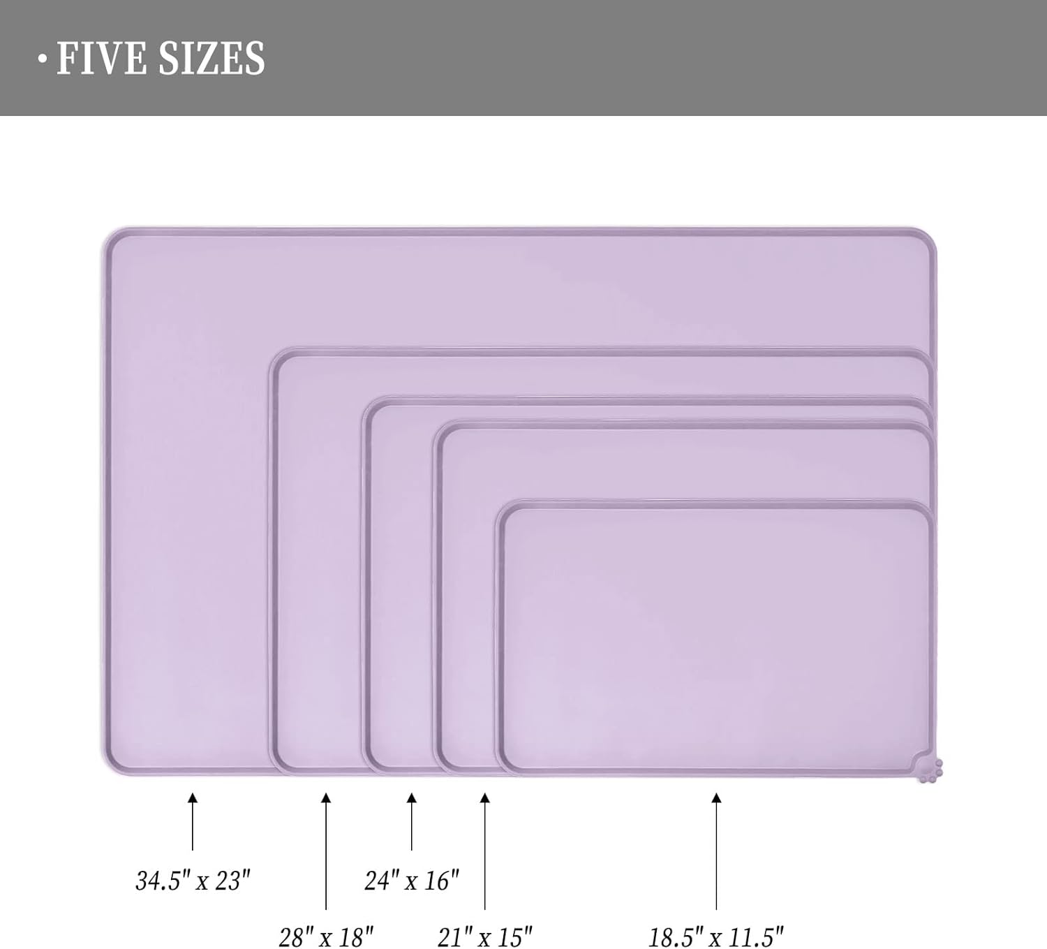 - Various sizes available: our pet mats come in 5 different sizes - 18.5" x 11.5", 22" x 14", 24" x 16", 28" x 18", and 32" x 24". Suitable for all kinds of pets, from puppies to large pets, choose the perfect size for your furry friends and avoid messy spills at mealtime
