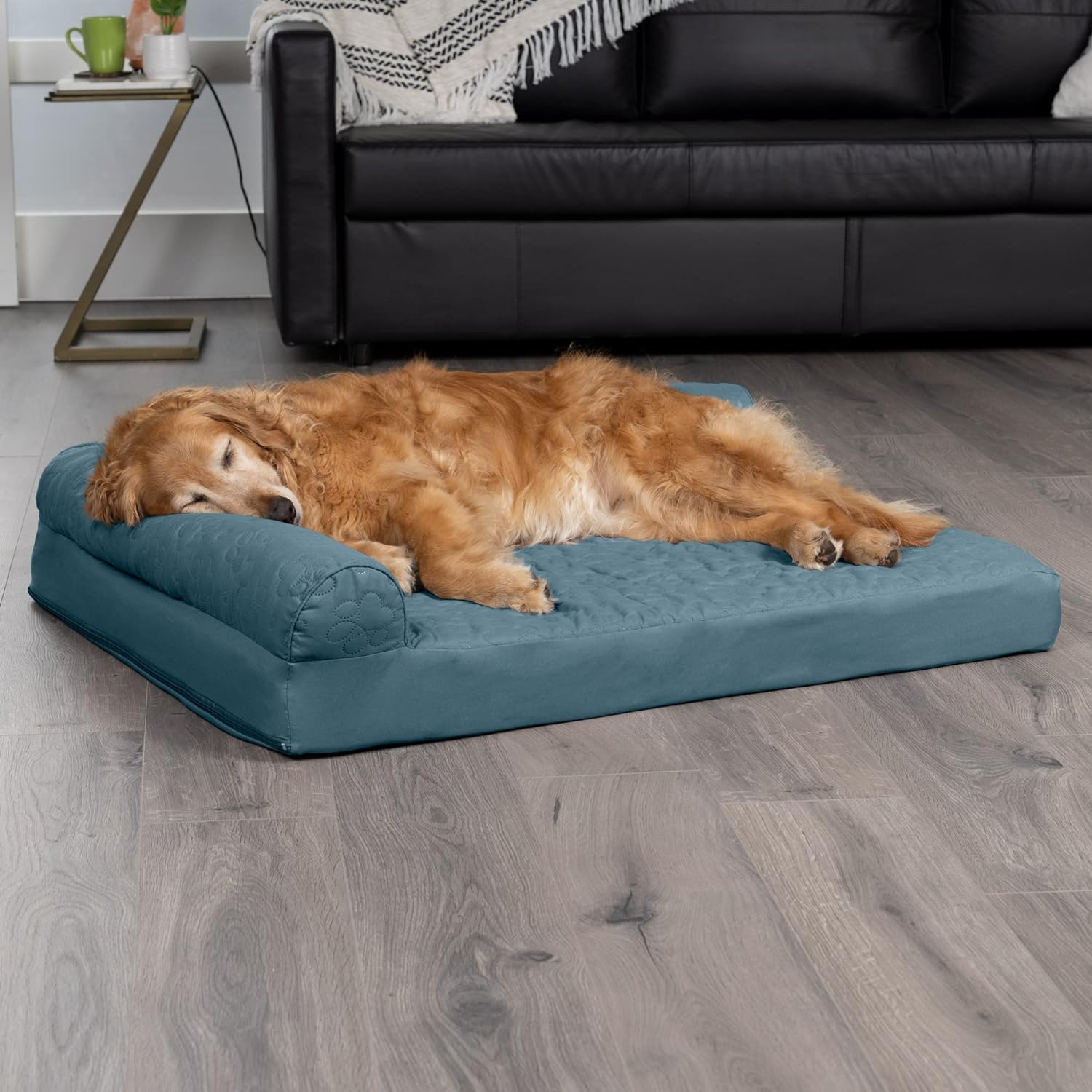 Furhaven Cooling Gel Dog Bed for Large Dogs w/ Removable Bolsters & Washable Cover, For Dogs Up to 95 lbs - Pinsonic Quilted Paw L Shaped Chaise - Bluestone, Jumbo/XL