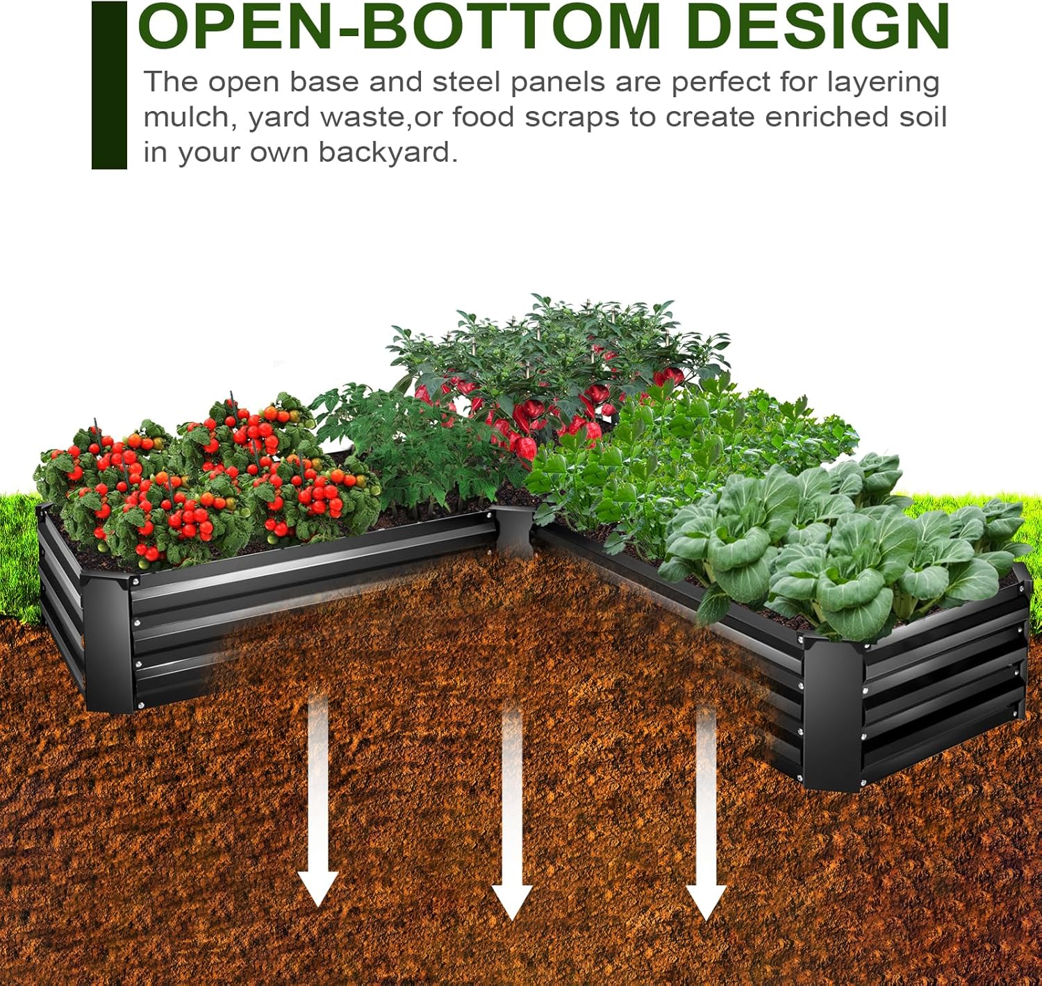 - Bottomless Design: Our metal raised garden bed is bottomless, promoting optimal drainage and healthy root growth. It's easy to install on any surface, perfect for a variety of outdoor garden settings.