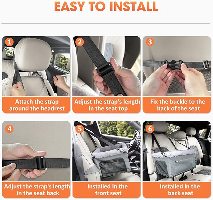 - ๐ถ[Easy to Install]: With its adjustable buckle design, the car seat for dogs can be easily installed. Simply attach the two straps around the headrest, fix the buckle to the back of the seat, and adjust the strap length as needed. It can be installed in both the front and back seats of your car, and it is compatible with most types of car seats and car models.