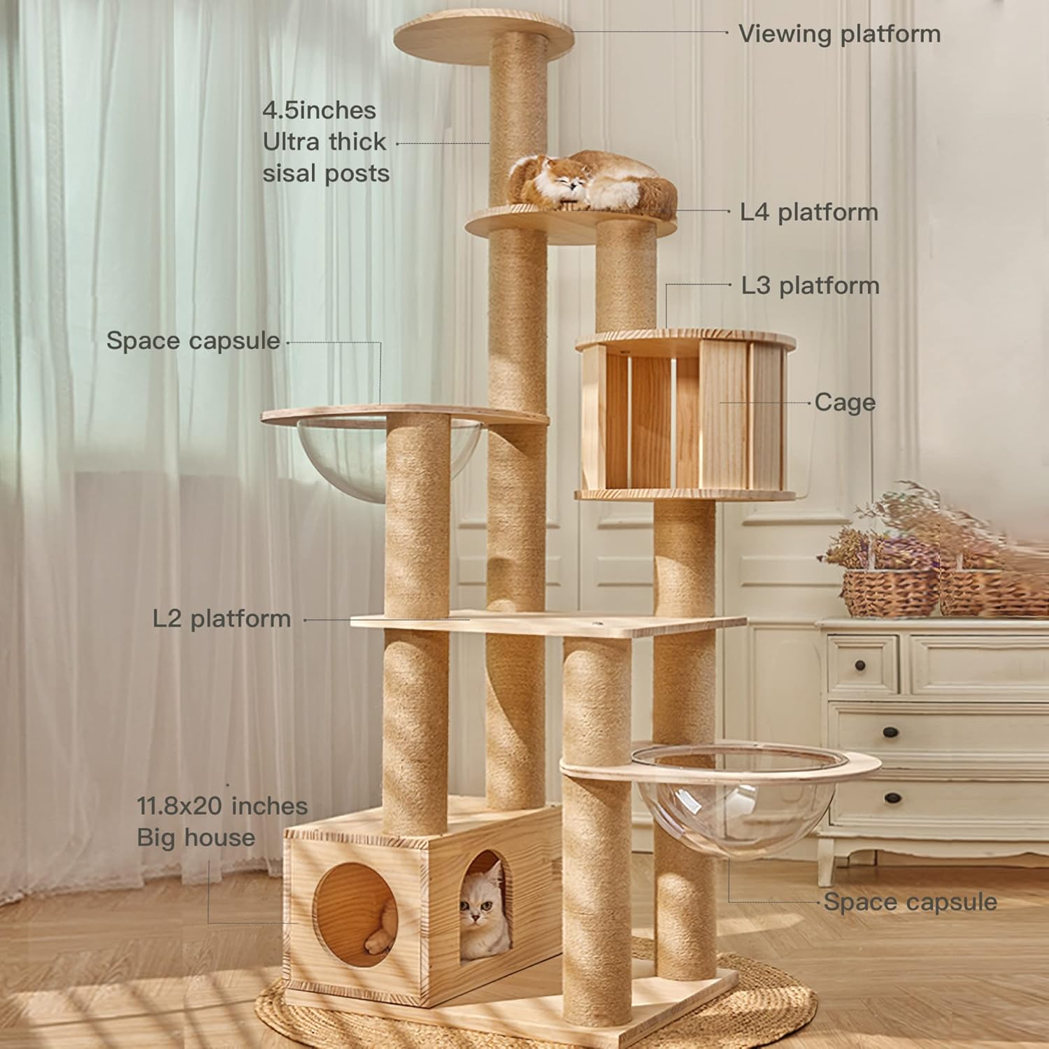 Modern Multi-Level Large Real Solid Wood Cat Tree, Luxury Wooden Cat Tower Cat Condo with Multi-Layer Platform for Indoor Cats