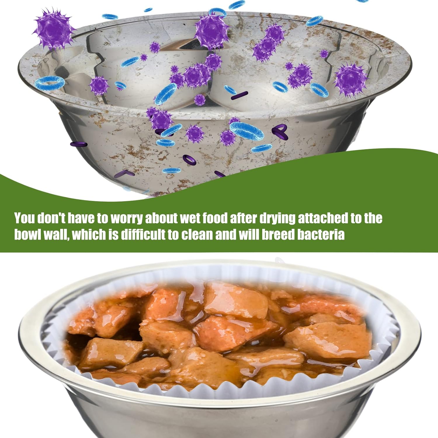 - Clean and Sanitary: the disposable pet food liners can put in the pet bowls, suitable to hold pet dry or wet food, providing your pets a clean feeding environment, also you do not worry about the food will attach to the bowl after drying, reducing the cleaning problem