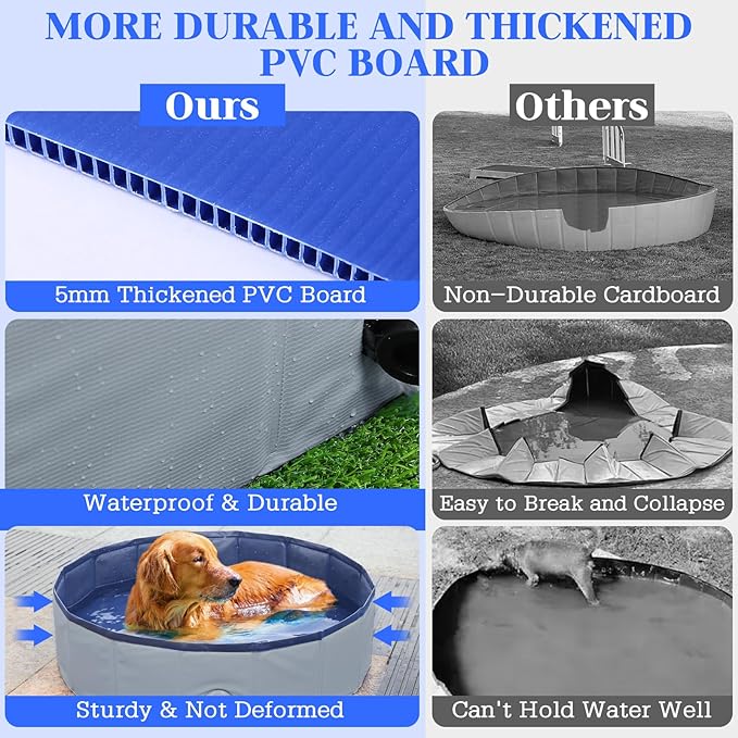 - 【High-quality Material, Sturdy Durable】The dog pool / kids pool is made of high-density fiberboard and high-quality PVC material. Strong enough and uneasy to collapse and deform. The bottom is made of abrasion resistant non-slip textured fabric, non-toxic and waterproof, perfect water retention. It also can prevent your pets from slipping when they jump around in the bath pool. Tips: Please trim your puppy's nails to prevent damage or leakage to the inner wall.