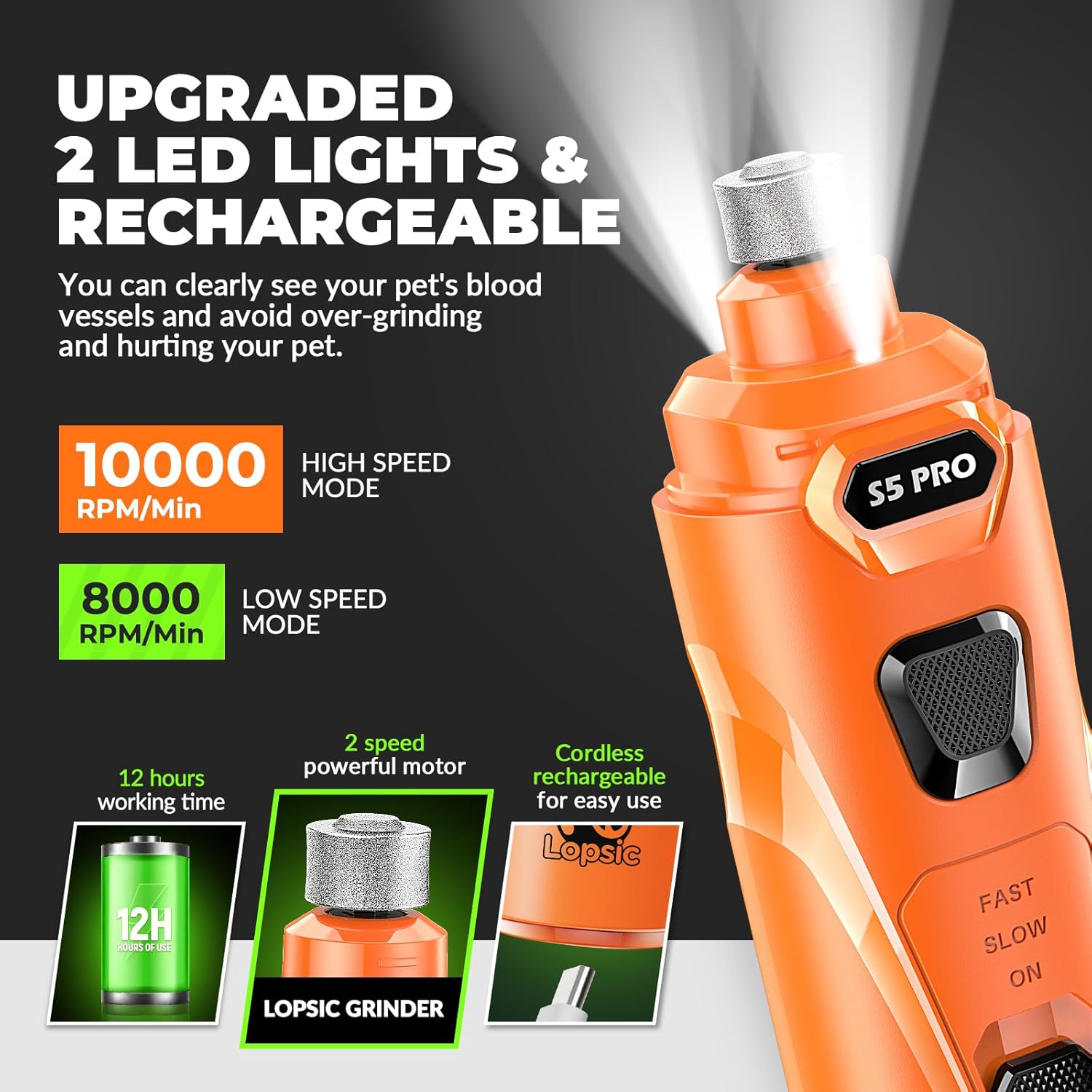- 【Improved Precision: 2 LED Lights & Adjustable Speeds】: LOPSIC dog nail grinder for dogs features 2 LED lights that offer clear visibility of the quick, ensuring precise and safe nail trimming for your pets. The adjustable speeds(8,000 RPM to 10,000 RPM) of dog nail trimmers can adapt to small, medium and large pets nail trimming needs. When using the dog nail trimmers at the proper speed, pet nails of different hardness can be efficiently ground