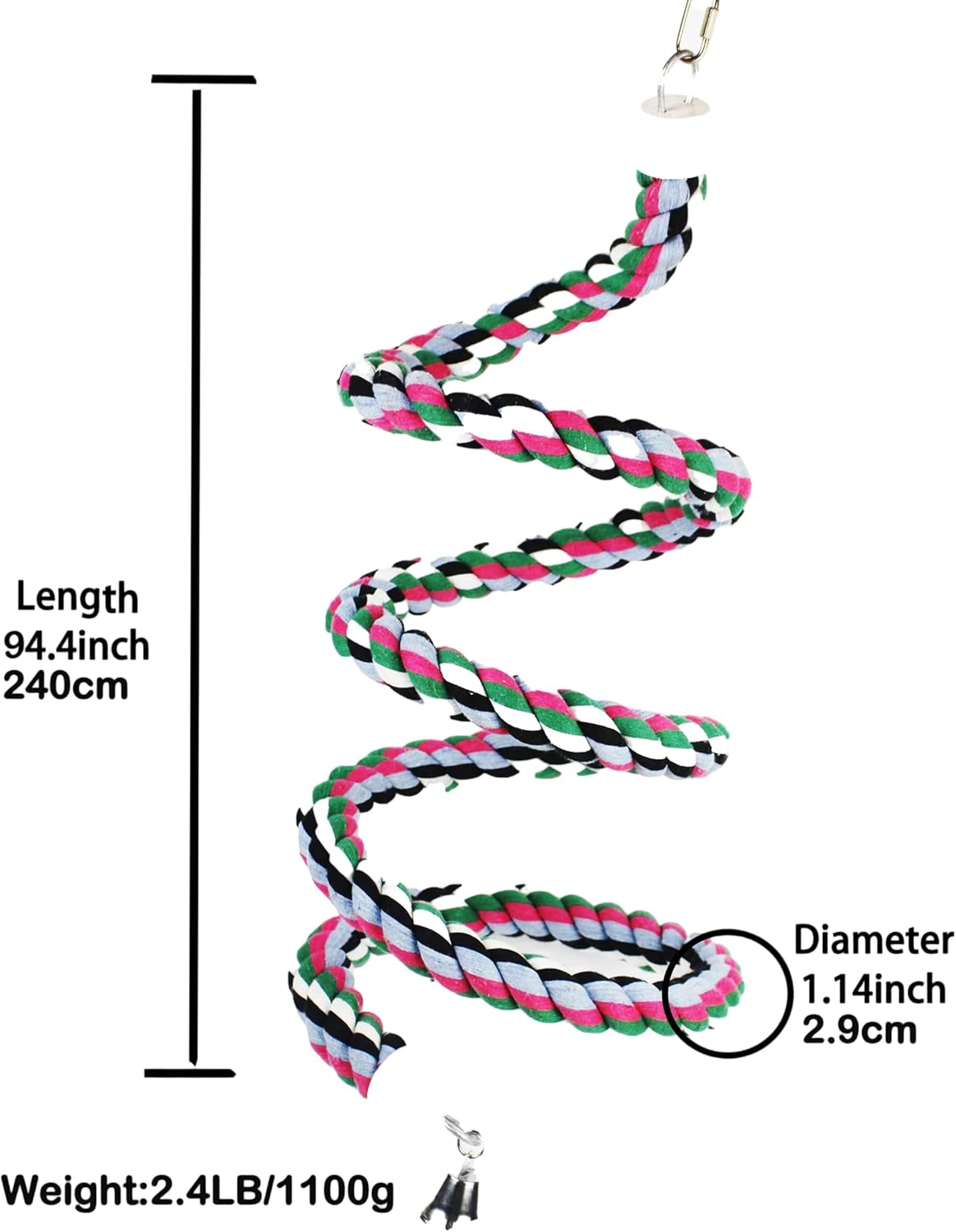 - š¦[WHAT YOU GET] 1pc 94.4inch length soft cotton spiral rope with metal bell,fully closed/open hook can hang in birdcage or outside safety,bendable internal steel wire can re-sharp it provide more fun for your pets