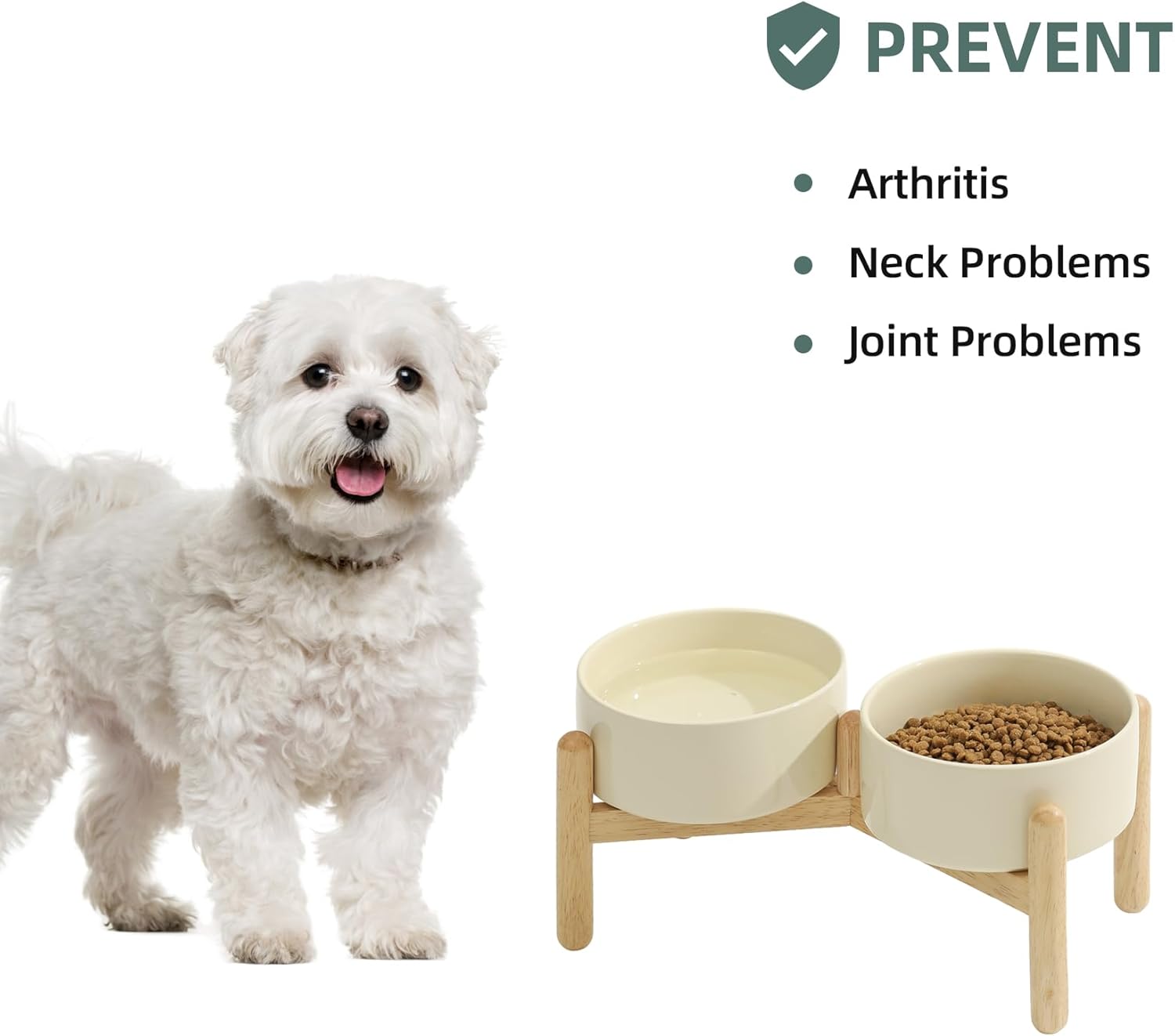 Ceramic 6.1inch Raised Dog Bowl with Stand for Small and Medium Breed Dog Dish Pet Food and Water Bowl (Double Bowl with Stand - Beige, 28oz)