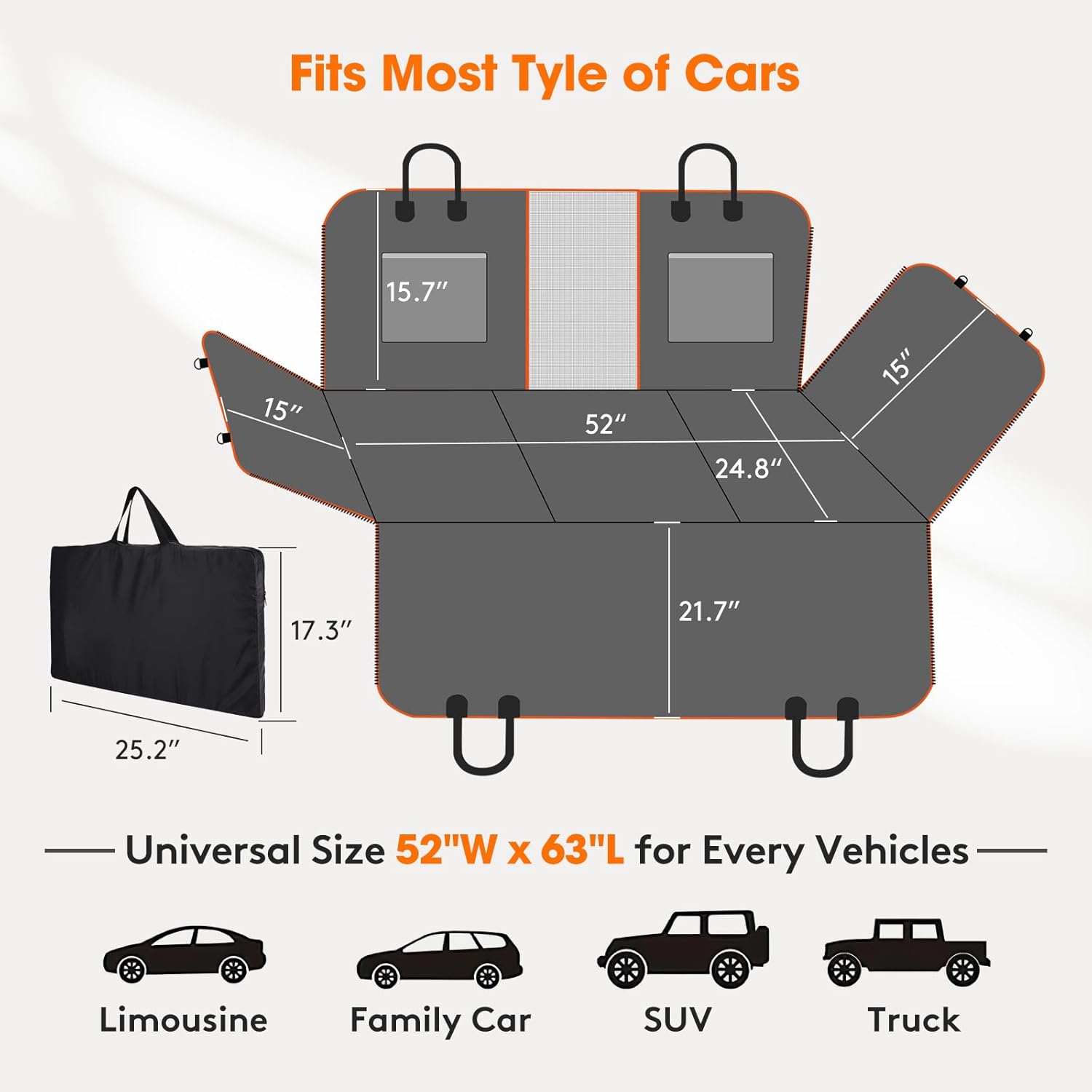 - 【6-Layer Durability & Protection】No more slouchy dog seat covers! Unlike the traditional seat cover being soft and easy to collapse, it can hold up a weight capacity of 280 lbs, making it suitable for various dog sizes! The 52"W x 63"L backseat seat covers for cars uses the new upgraded fabric of 6-layer fabrics, this dog back seat cover is waterproof to protect your seat from mud, liquid, and hair.