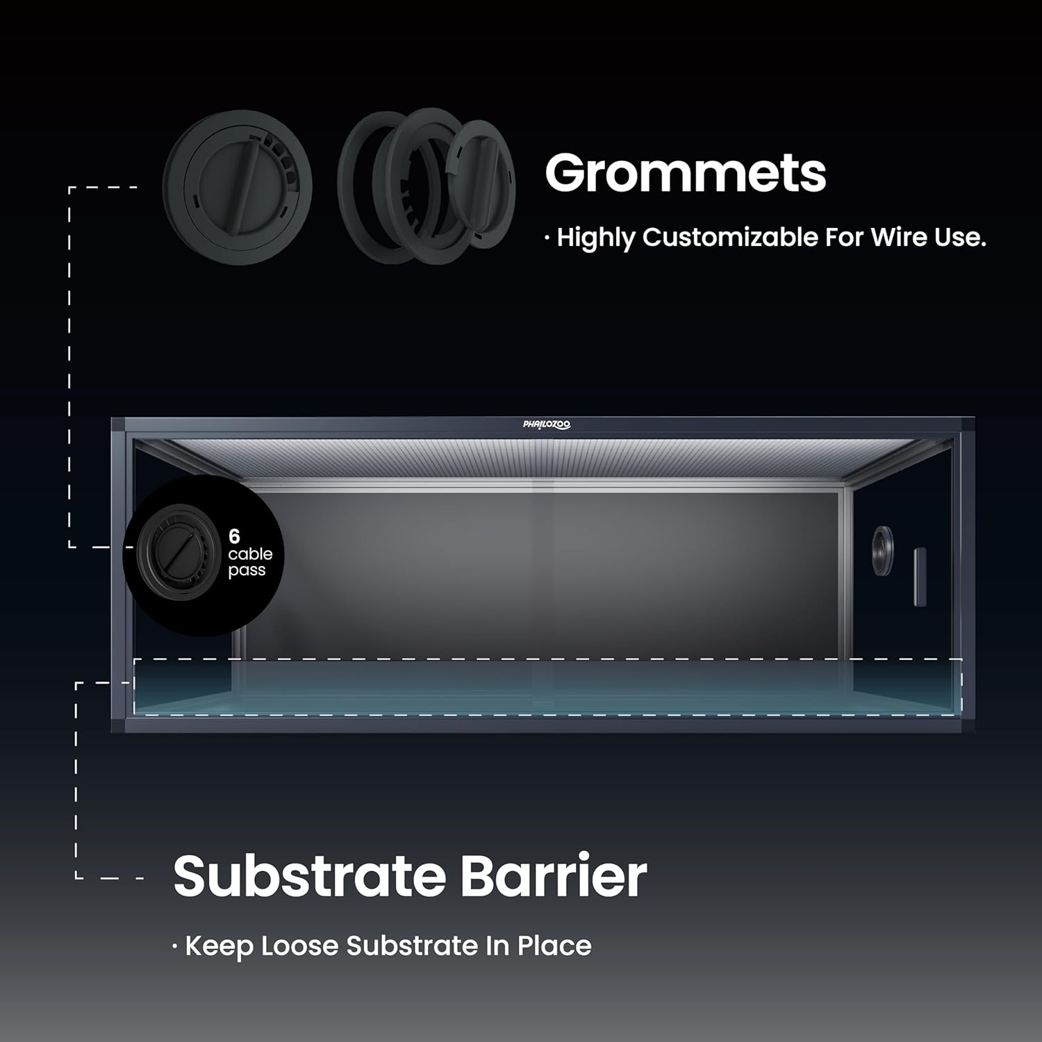 - 【Easy Maintenance】Front opening reptile terrarium with door handles included for easy cleaning & feeding. No more suction cup problems or unsightly fingerprints all over. The substrate barrier keeps the substrate in place. Our tempered glass doors are durable enough to withstand scratching.
