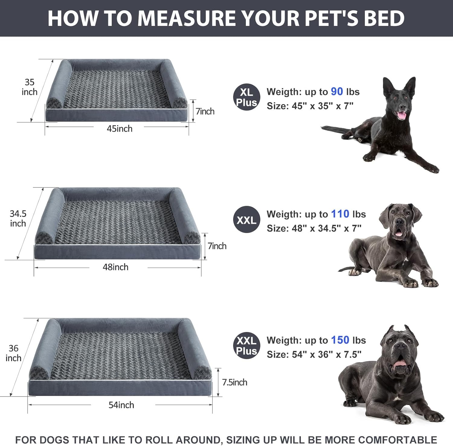 - DIMENSIONS (DOG BEDS FOR MEDIUM DOGS): jumber plus dog bed 54" x 36" x 7" (3.5" bolstered side ) for medium and large dogs up to 150 lbs. For dogs that like to roll around, sizing up will be more comfortable.