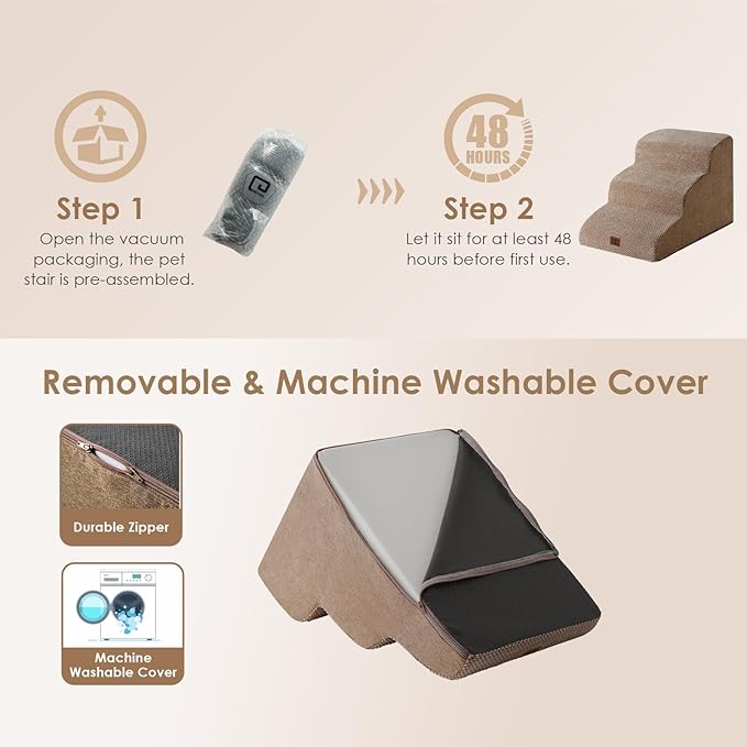 - SPECIFIC AND STEADY DESIGN - 33D density of pure foam make this stair more steady when your pets walk on. The dog bed stairs can provide strong support for pets in the walking process. Low angle slope design can better protect your pet's joints.
