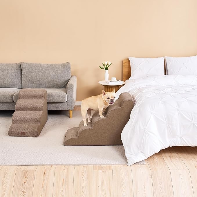 - COMFORTABLE PET STAIRS - This foam dog stair is designed directly against the edge of a bed, sofa or other furniture, so your pet can climb up and down comfortably.