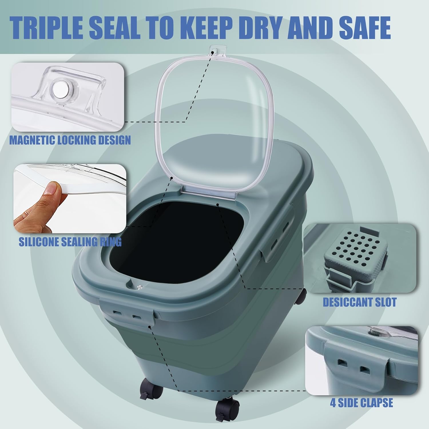 Collapsible Dog Food Storage Container with Lids, Airtight 30 35 Lbs Rice Cereal Flour Sugar Containers Dispenser, Sealable 20 25 Lbs Dog Pet Cat Bird Seed Kitchen Holder Bin Bucket with Rolling Wheel