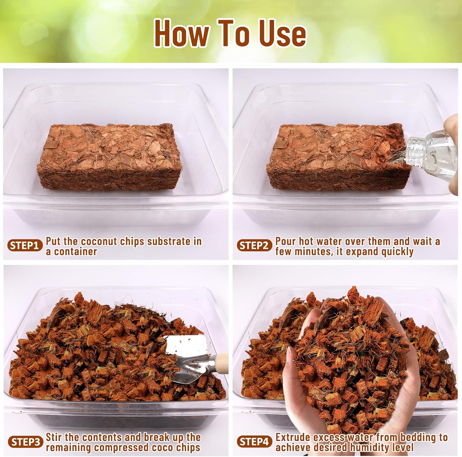 - Easy to Use and Store: Simply add water to expand and use, it can expand to several times its original size. Coconut chips are chunky, without other substances or impurities, no dust and sharp pieces, so you don't have to worry about scratching or cutting your pets skin. Compressed packages are easy to use and store. Each brick is 8.2×4.1×2.2 inch