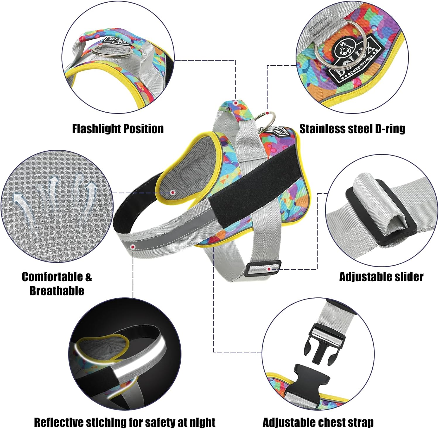 - SUPER COMFORTABLE: Bolux no choke dog harness pulling pressure is evenly distributed to the body to prevent pulling and choking. The dog vest harness have a adjustable chest strap with snap on buckle, move its body parts freely, can customized fits for your puppy growth do not need to always change it.