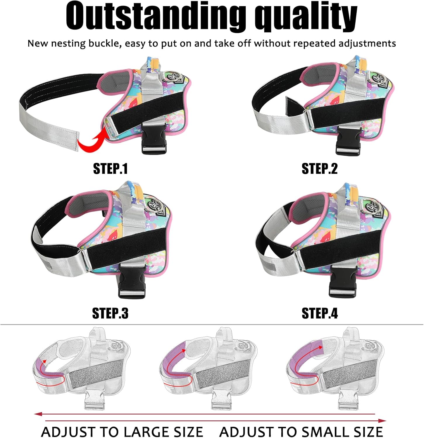 - STURDY HANDLE: The adjustable dog harness with rugged nylon handle further enhances your distance from the dog and is more intimate with each other. Easy on dog harness is also the best partner for dogs and is easy to control your dog.