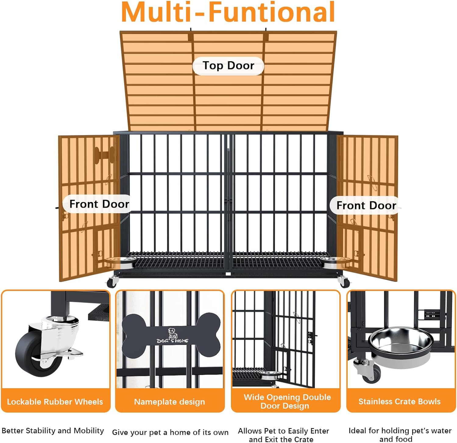 - 【Practical & Easy to Move and Clean】The dog crate comes with four smooth rolling locking wheels for easy movement and fixation, you can easily move the crate to different positions as needed. The dog crate comes with two pull-out tray for easy removal and cleaning. It also comes with a safety latch to avoid your smart dog from opening the iron door, effectively protect your pet.