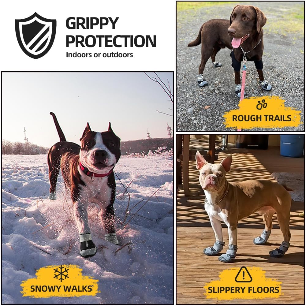 - Anti-Slip Boots for Dogs : Dog booties are soft and breathable to paws, doggy shoes effectively protect dog claws from heat, stones, glass. Wearing our doggy shoes not only enables our puppy to walk happily on hot pavement, but also protects the weak paws from snow, ice, rain during winter