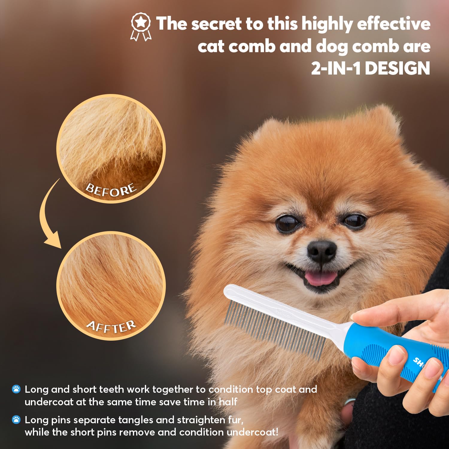 - PROFESSIONAL DOG & CAT GROOMING COMB specially designed long and short metal teeth groom your pet's top coat and undercoat at one time. Long pins separate tangles and straighten fur, while the short pins remove and condition undercoat!